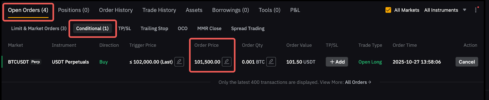 Так, ви можете змінювати ордери, перетягуючи цінову лінію вашого лімітного або умовного ордера. Однак, будь ласка, майте на увазі, що це обмежено зміною ціни ордера або ціни спрацьовування для активних лімітних або умовних ордерів відповідно. Щоб змінити ціну вашого умовного замовлення, перейдіть на вкладку «Відкриті замовлення» → «Умови».