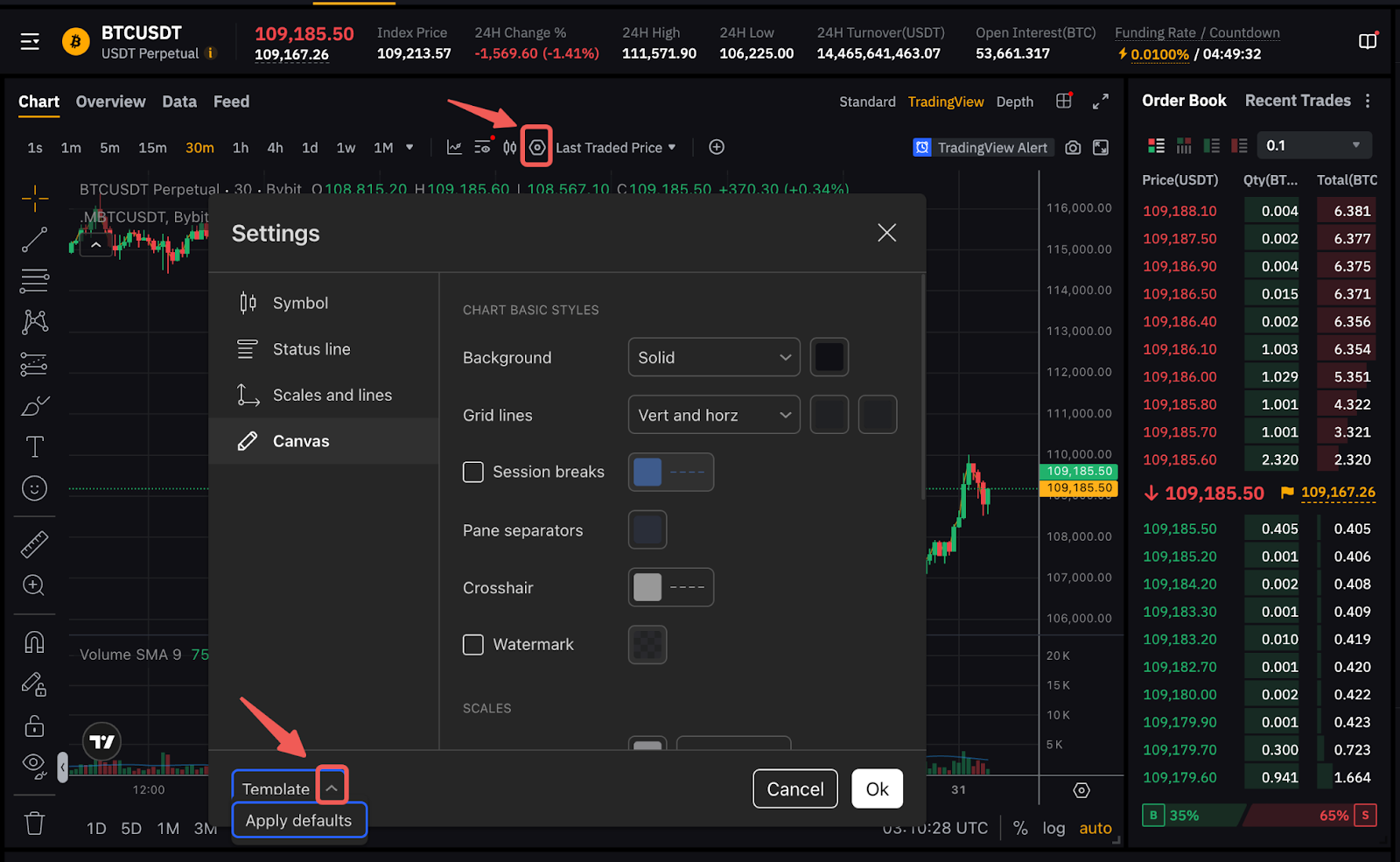 Натисніть правою кнопкою миші в області графіку, а потім виберіть Налаштування → Шаблон → Застосувати за замовчуванням. Або ж очистіть файли cookie та кеш вашого браузера, щоб відновити налаштування графіку за замовчуванням.
