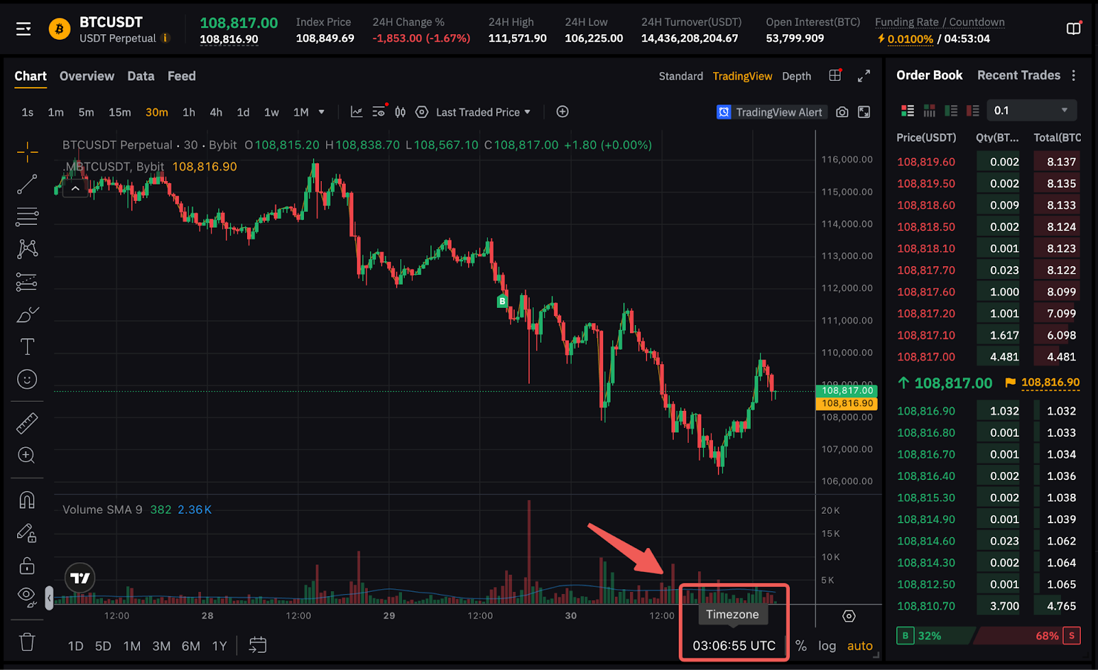 Ви можете натиснути на індикатор часу в правому нижньому куті графіка, щоб вибрати бажаний часовий пояс.