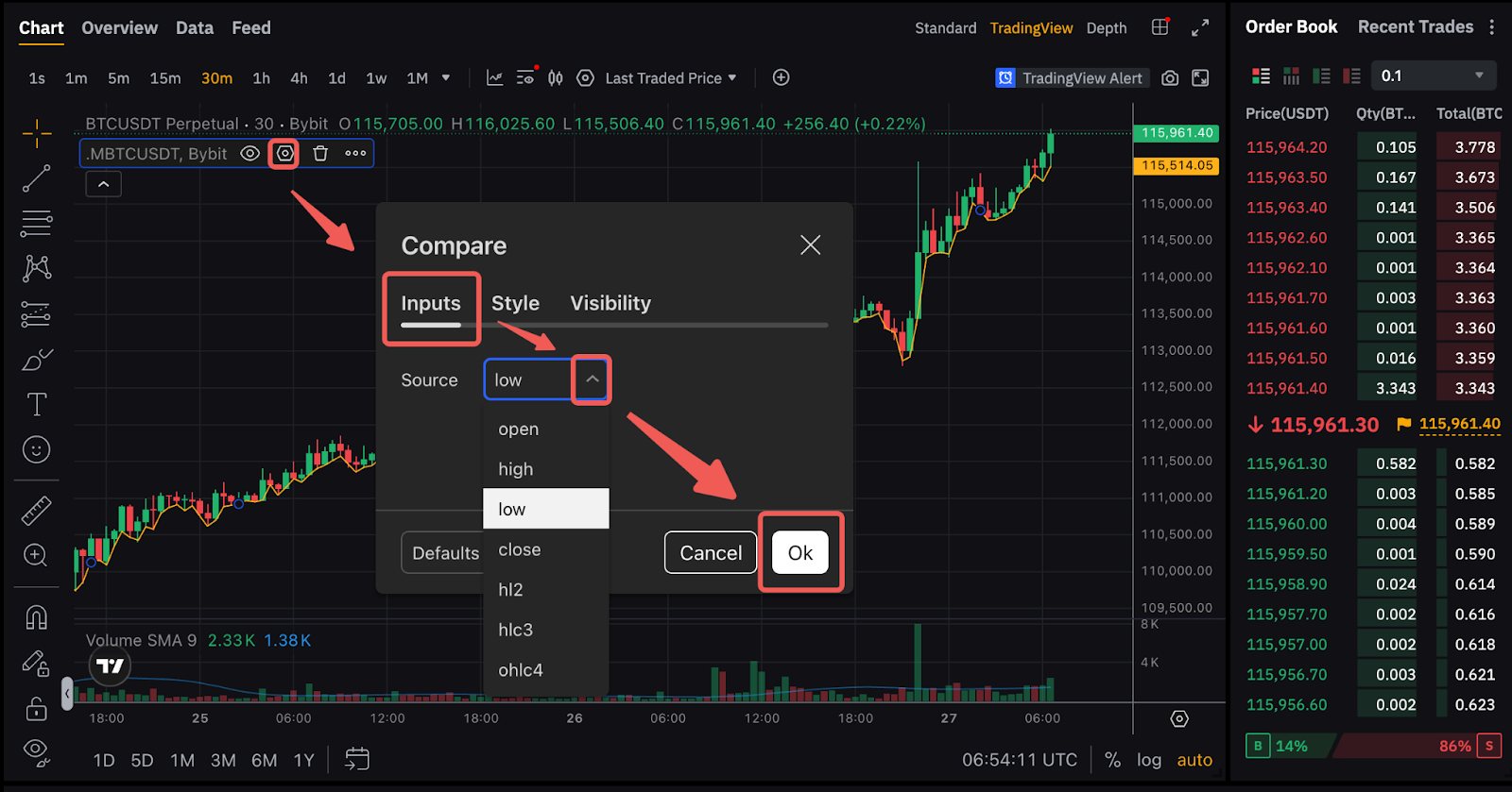 На прикладі BTCUSDT натисніть на Ціна Останньої угоди в меню графіка і перейдіть до індикатора .MBTCUSDT, BYBIT. Змініть налаштування жовтої лінії .MXXX, вибравши значення High (для короткої позиції) або Low (для довгої позиції).