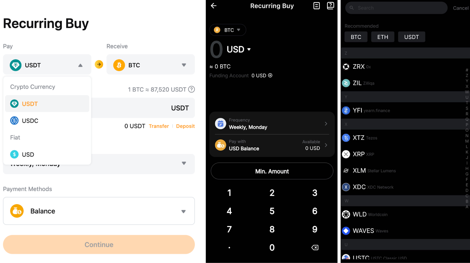 Клацніть спадаючий список валюти Регулярна купівля, щоб дізнатися про доступні криптовалюти та фіат.