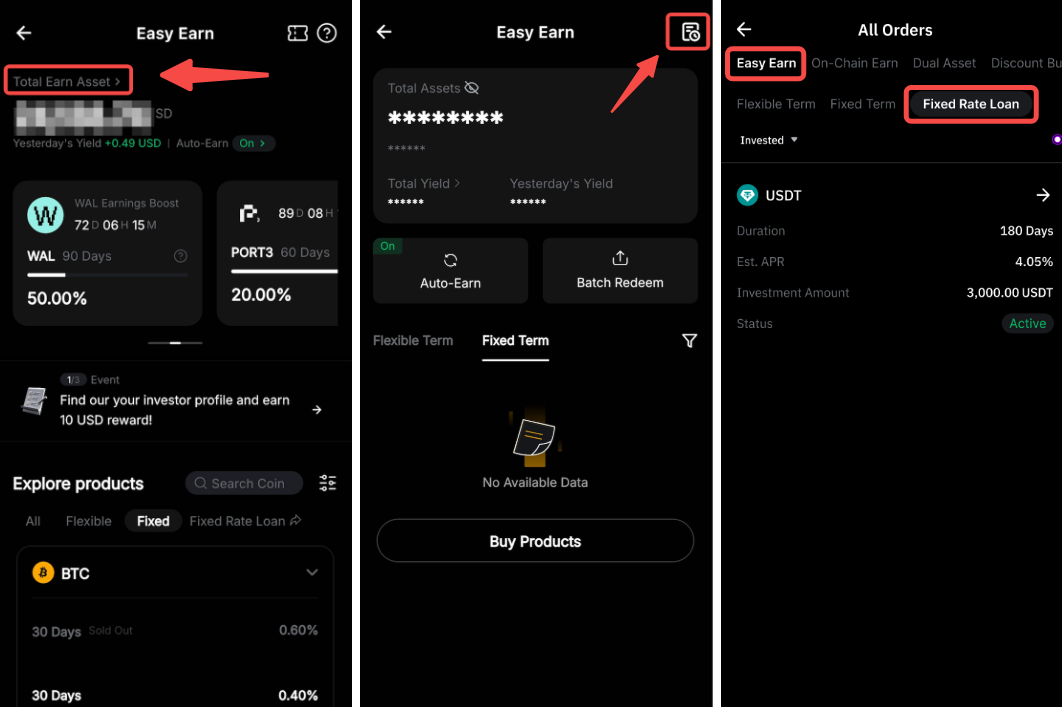 Якщо ви отримуєте доступ через застосунок, перейдіть до розділу Earn → Easy Earn → Усього активів у Earn → Значок історії → Easy Earn: Позика з фіксованою ставкою.