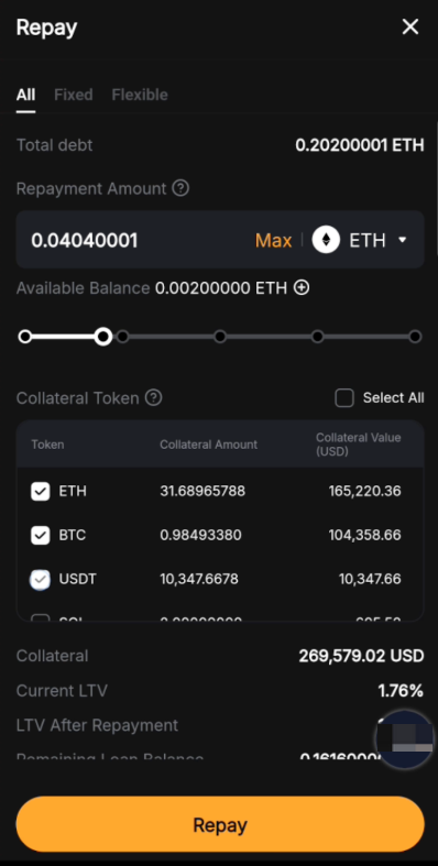 Так, щоб керувати ринковим впливом великих погашень шляхом конвертації монет, ми запроваджуємо ліміт на одне погашення в розмірі 300 000 доларів США або еквівалент. Система спочатку використовує ваш доступний баланс того самого активу для погашення. Якщо залишок боргу нижчий за системний ліміт, погашення відбувається шляхом конвертації монет лише на суму нестачі; в іншому випадку ця опція недоступна.