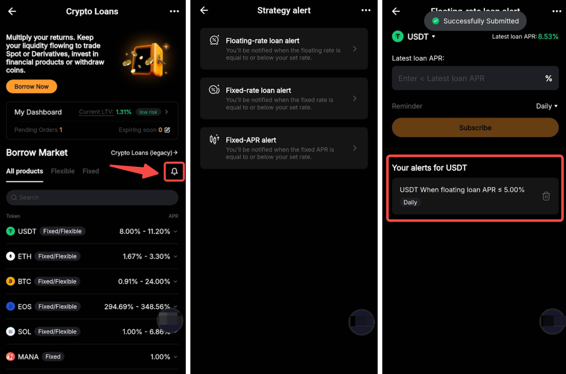 Так, ви можете налаштувати стратегічне сповіщення для Криптопозики, увійшовши в застосунок Bybit, перейшовши в Криптопозики, торкнувшись значка дзвіночка, вибравши бажаний тип сповіщення (плаваючу ставку, фіксовану ставку або фіксовану APR), вибравши монету та встановивши ставку, щоб отримувати сповіщення, коли ставка досягає або падає нижче цільового значення.