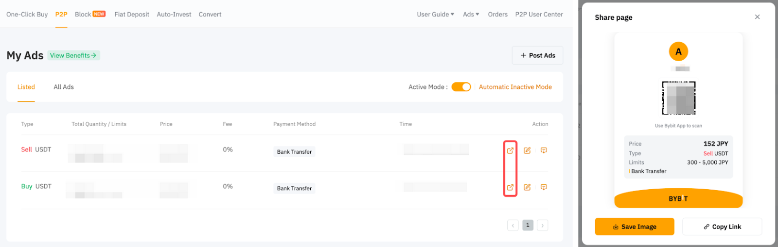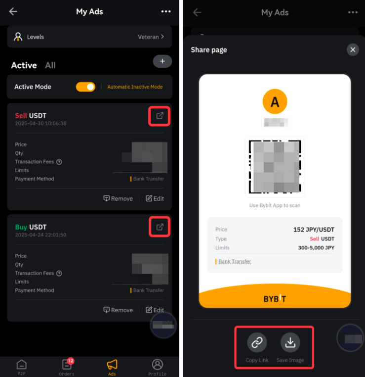 Ви можете поділитися своїми оголошеннями за допомогою QR-коду або URL-посилання. Оголошення може бути публічним або закритим. Публічне оголошення відображається на сторінці оголошень P2P, а оголошення, яке не є загальнодоступним, доступне лише трейдерам, які мають QR-код або URL-посилання.