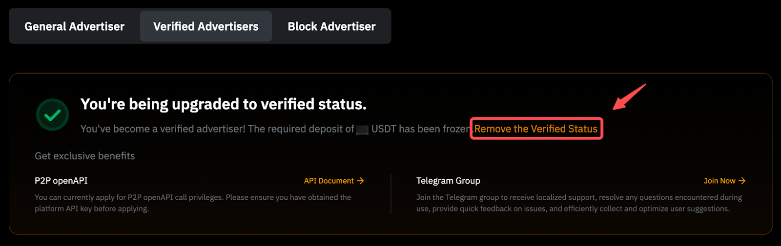 Зверніть увагу, що після видалення статусу перевіреного мерчанта ви більше не матимете права на його переваги. Щоб дізнатися більше про переваги використання перевіреного мерчанта, відвідайте сторінку Програма рекламодавців P2P.