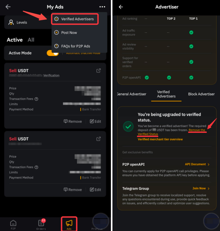 У додатку перейдіть на сторінку P2P торгівля → Оголошення, натисніть на піктограму «3 крапки» у верхньому правому куті та виберіть Перевірений мерчант, а потім натисніть Видалити статус перевіреного мерчанта.