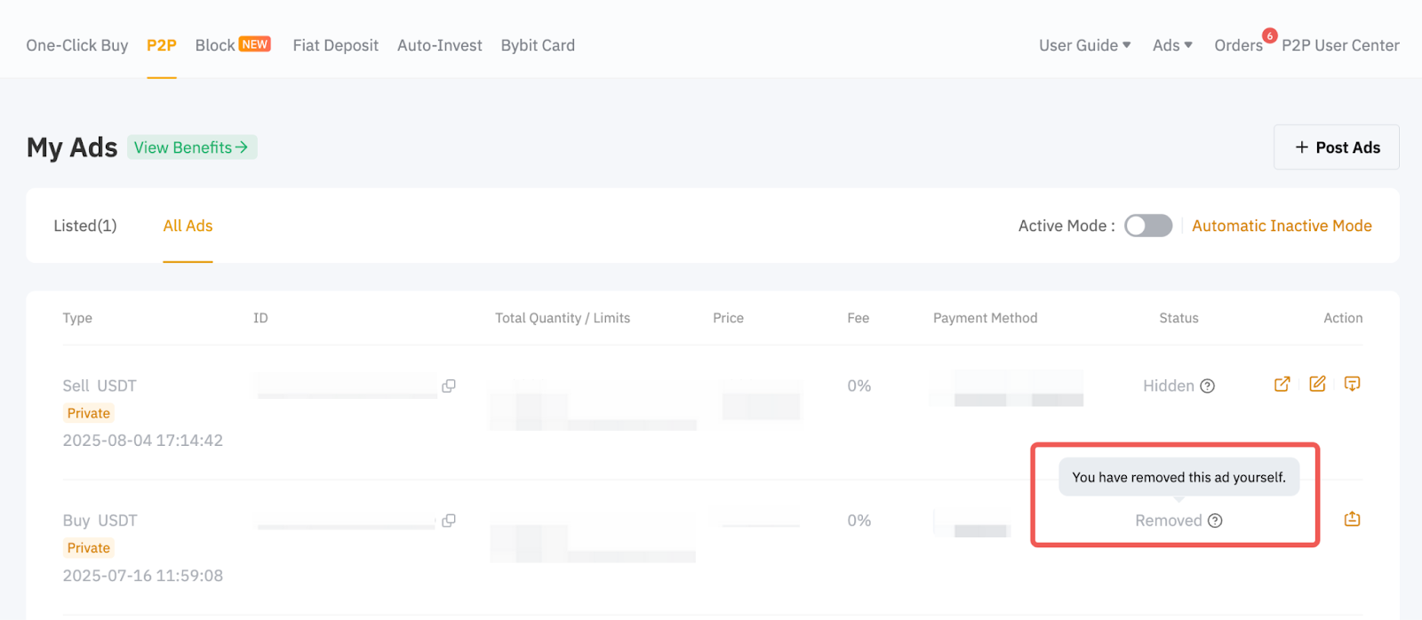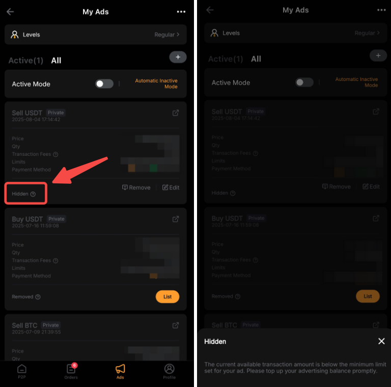 Причини, через які ваші оголошення не відображаються у списку P2P-оголошень, наведені нижче:
