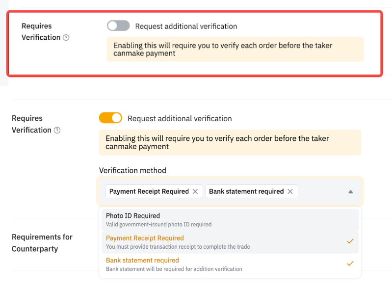 Чи можу я вимагати від контрагентів проходження верифікації перед угодою? Так, перевірені та блочні мерчанти можуть встановлювати вимогу верифікації під час створення Р2Р оголошення. Більше інформації — у статті Як Розмістити Торгове Оголошення На P2P?.