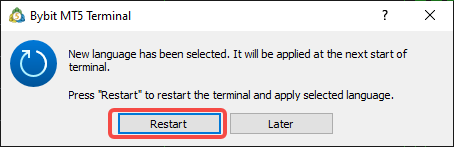 Після завершення з’явиться діалогове вікно з пропозицією перезапустити термінал. Натисніть Перезапустити, і нові мови будуть застосовані після повторного відкриття клієнтського термінала MT5.