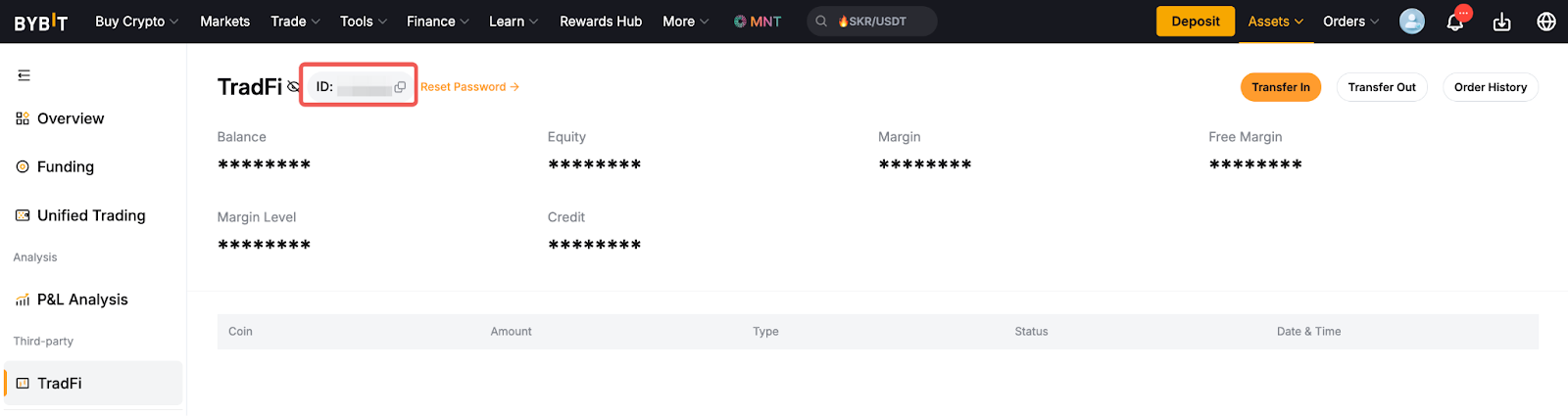 Для безперешкодного доступу та зручнішої торгівлі TradFi вже інтегровано у ваш акаунт Bybit. Однак ви все ще можете торгувати через клієнтський термінал MetaTrader, використовуючи свій ID акаунта MT5. Після успішної активації вашого акаунта TradFi ви можете перевірити дані свого логіна, натиснувши на розділ MT5 ID у розділі Дані акаунта.