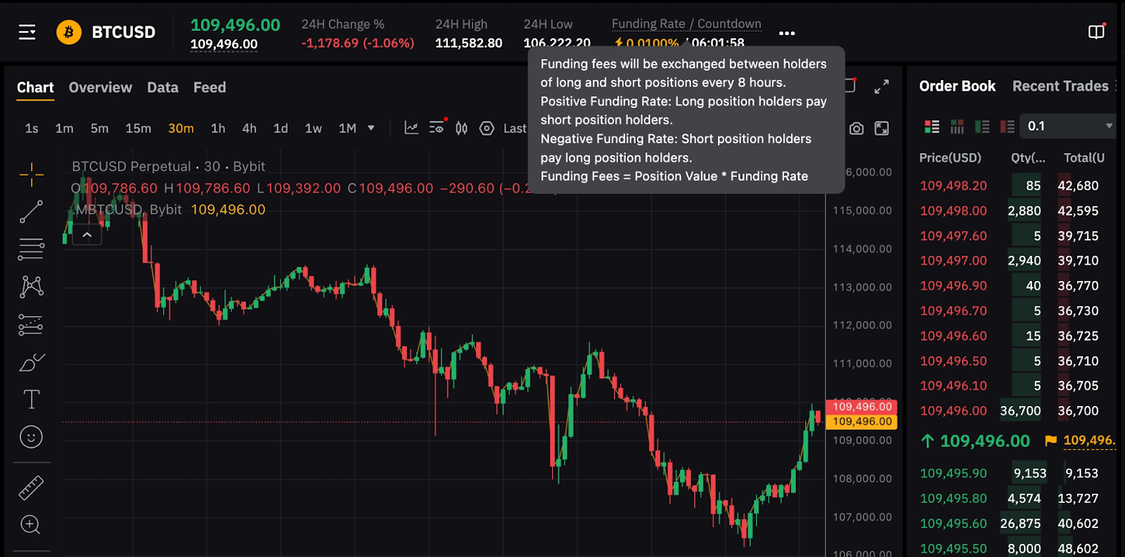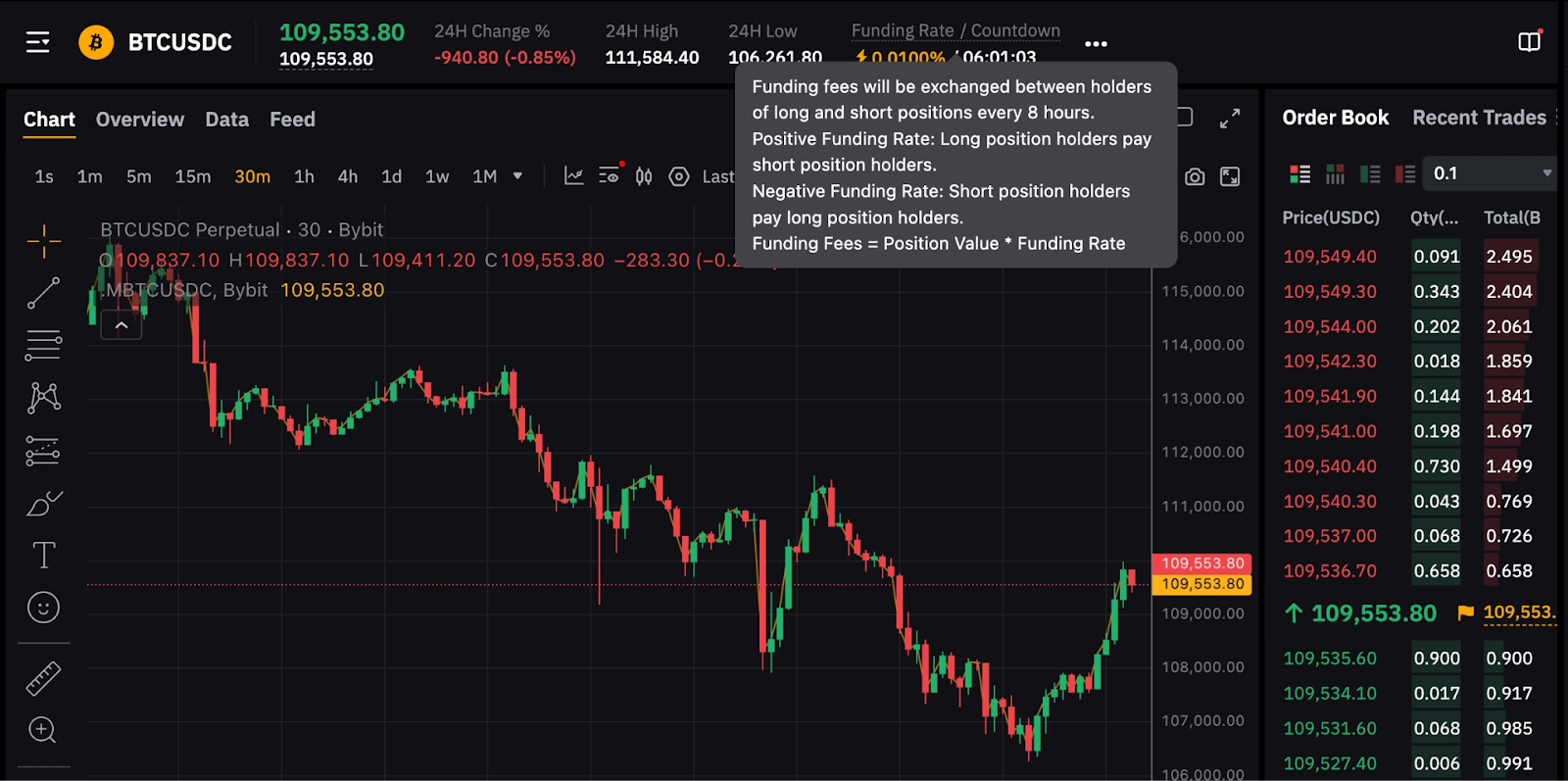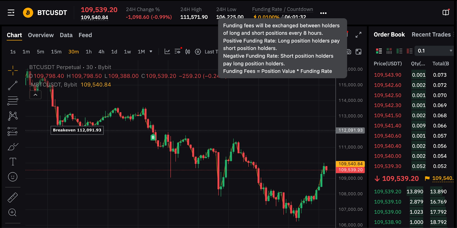 Фінансування — це основний механізм, що забезпечує постійне прив’язування ціни останньої угоди на Bybit до глобальної спотової ціни. Він подібний до витрат на сплату відсотків за утримання контрактів у спотовій маржинальній торгівлі. Ось як це відбувається на Bybit: