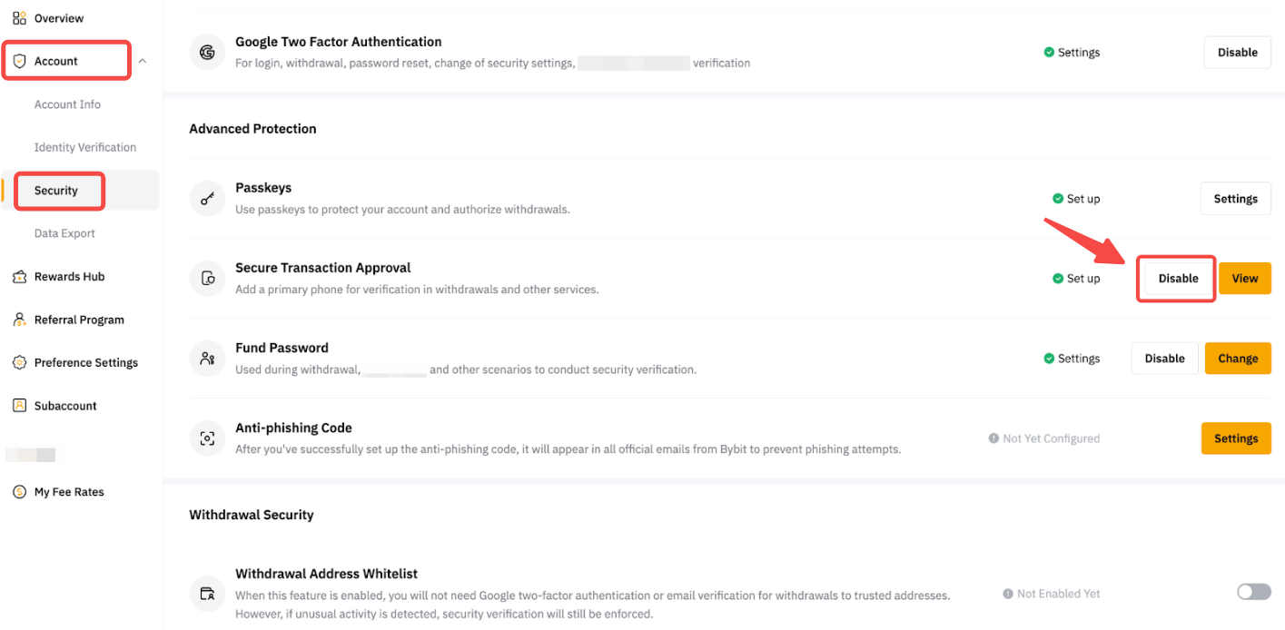 Крок 1. Натисніть на зображення профілю у верхньому правому куті, а потім перейдіть в Акаунт → Безпека → Додатковий захист. У розділі Додатковий захист натисніть Вимкнути поруч із пунктом Безпечне схвалення трансакцій.