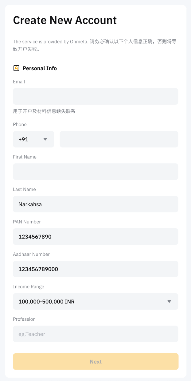Крок 3. На сторінці створення нового акаунта вкажіть свої особисті дані, такі як П. І. Б., адресу електронної пошти, номер телефону, номер PAN, номер Aadhaar тощо. У деяких випадках вас можуть направити на сторонню платформу для подання додаткової інформації, що посвідчує особу.