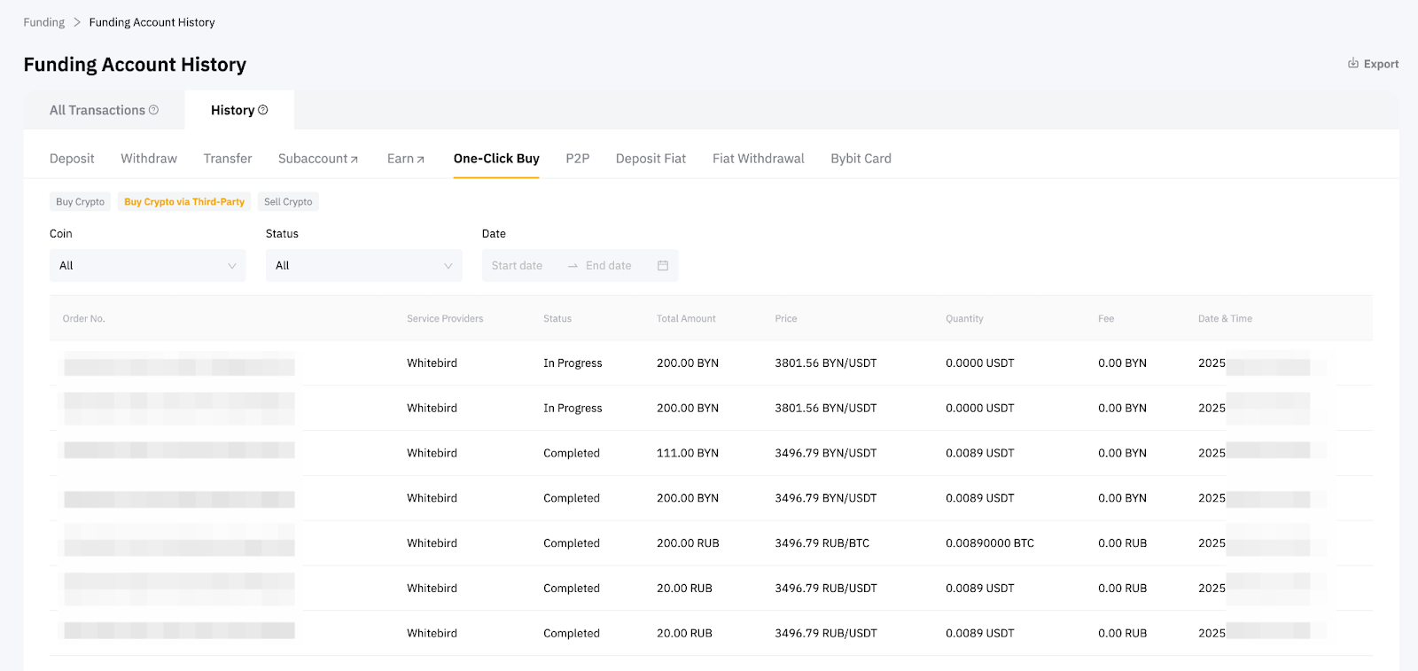 Крок 5. Після успішної купівлі криптовалюти на своєму акаунті Bybit ви можете знайти свій актив на акаунті фінансування. Якщо ви хочете переглянути записи попередніх транзакцій, їх можна знайти в розділі Купівлі криптовалюти через третю особу на сторінці історії ордерів.