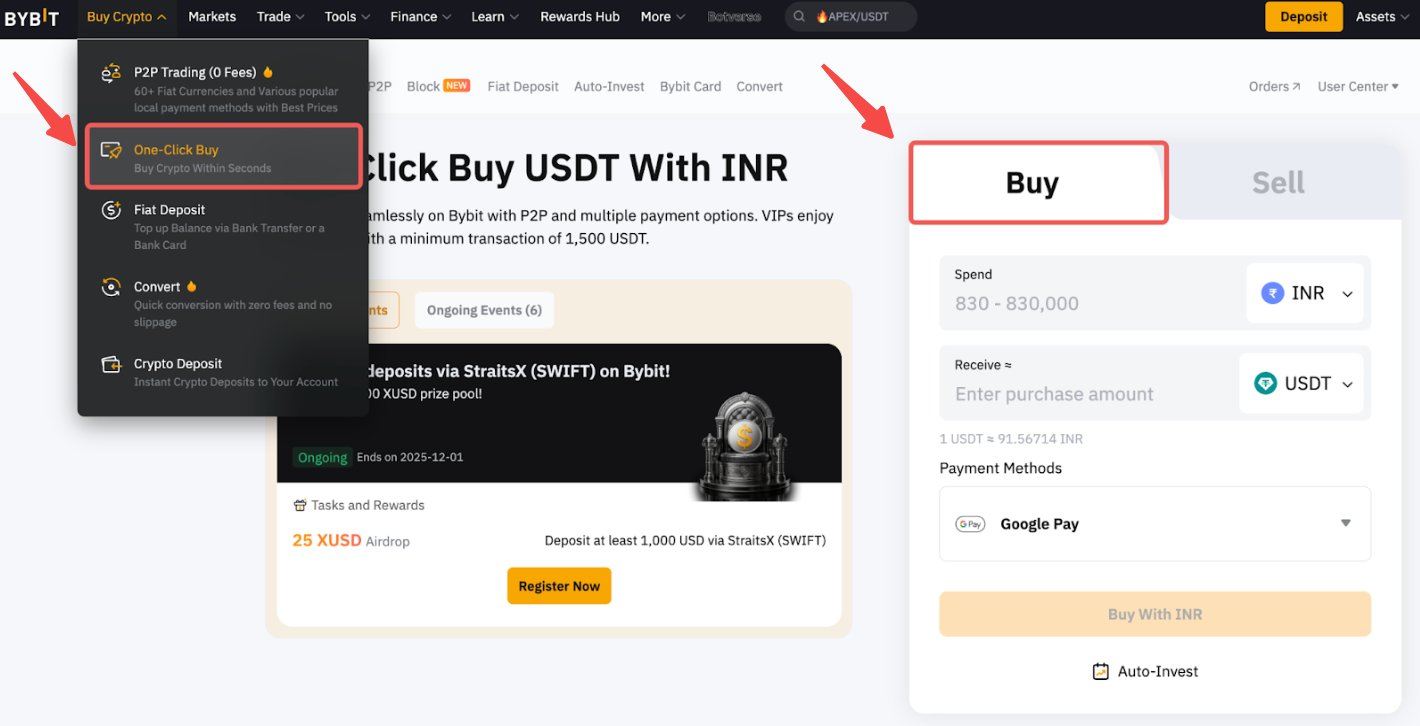 Крок 1. Натисніть Купити криптовалюту → Купівля в один клік у верхньому лівому куті навігаційної панелі, щоб перейти на сторінку функції «Купівля».