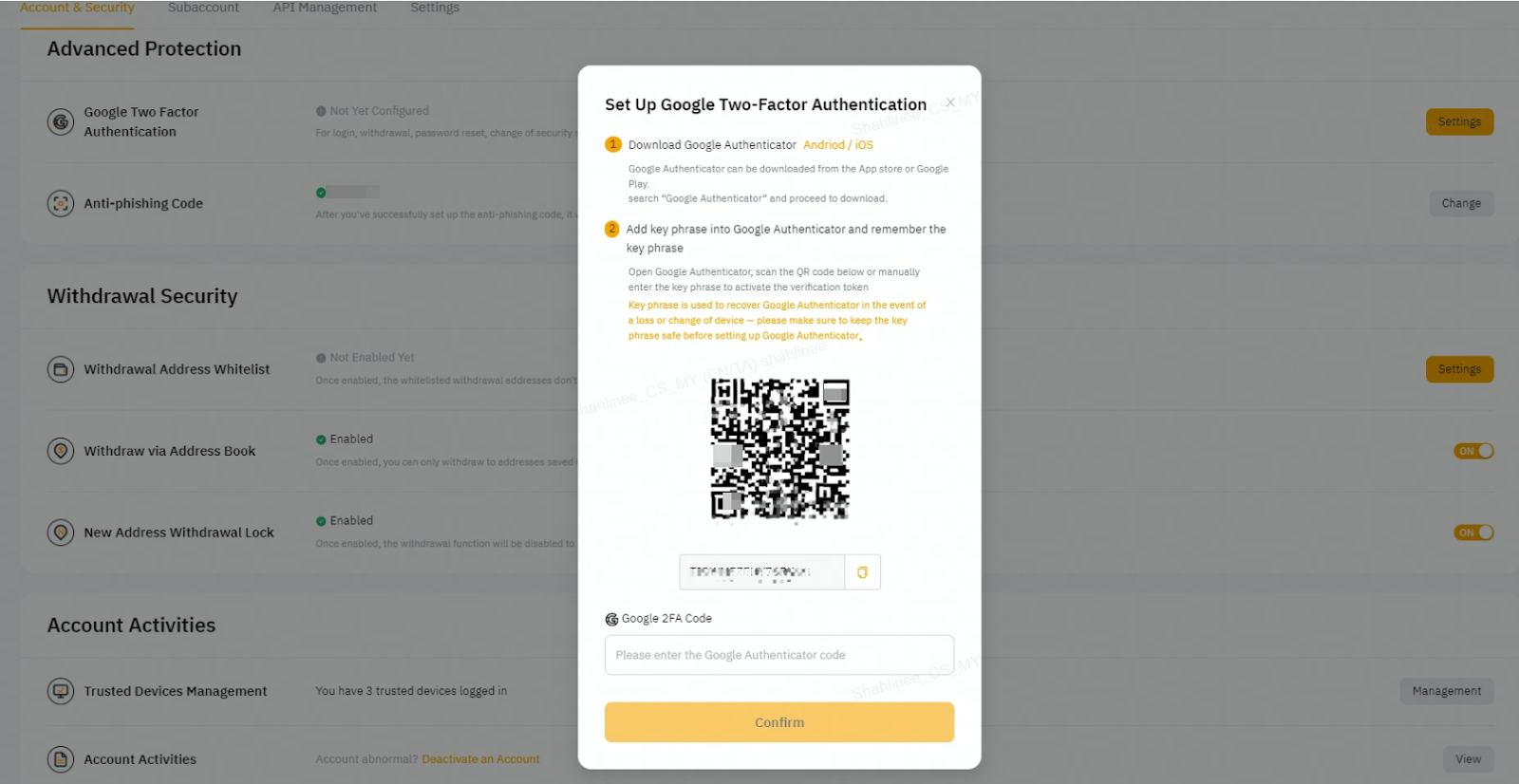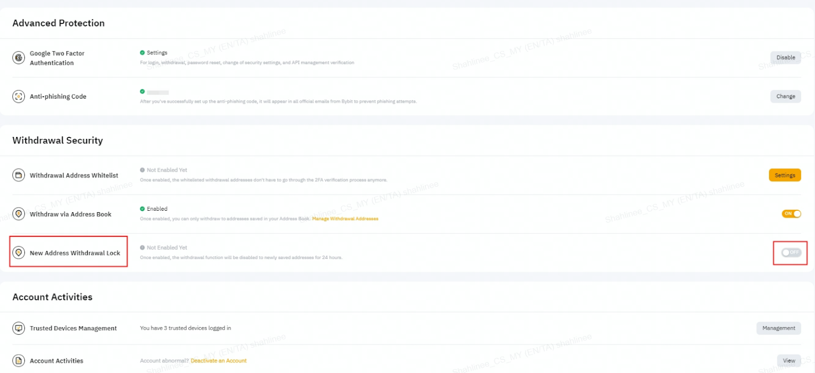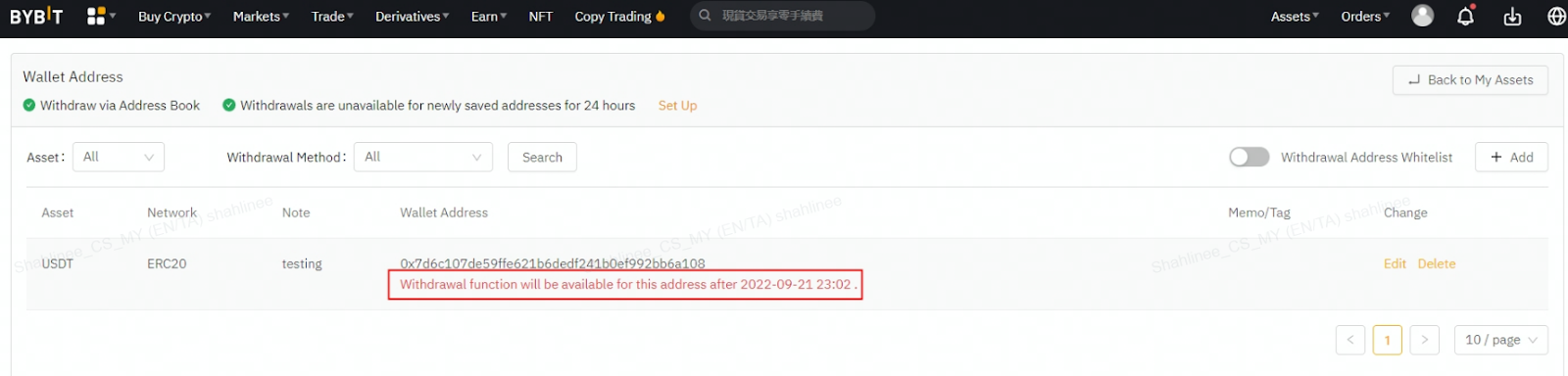 Після ввімкнення цієї функції щойно додану адресу для виведення коштів не можна використовувати протягом наступних 24 годин. Це забезпечує додатковий рівень безпеки і допомагає запобігти несанкціонованому зняттю коштів. Будь ласка, відвідайте цей розділ, щоб дізнатися, як керувати безпекою зняття коштів.