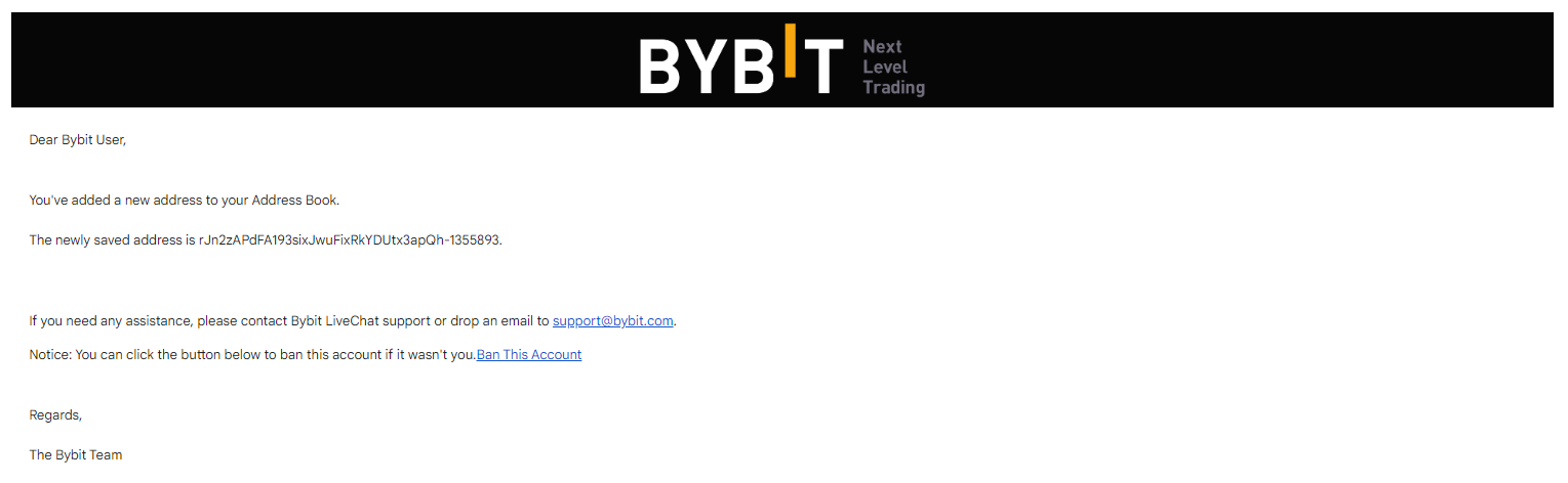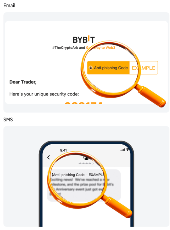 Антифішинговий код компанії Bybit — це персоналізована функція безпеки, що складається з унікальної комбінації букв, цифр і символів. Після увімкнення цей код з’явиться в усіх офіційних електронних листах і текстових повідомленнях від компанії Bybit, що дозволить вам легко перевірити справжність інформації, яку ви отримуєте.