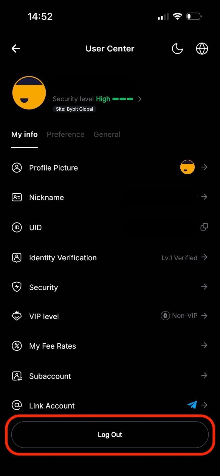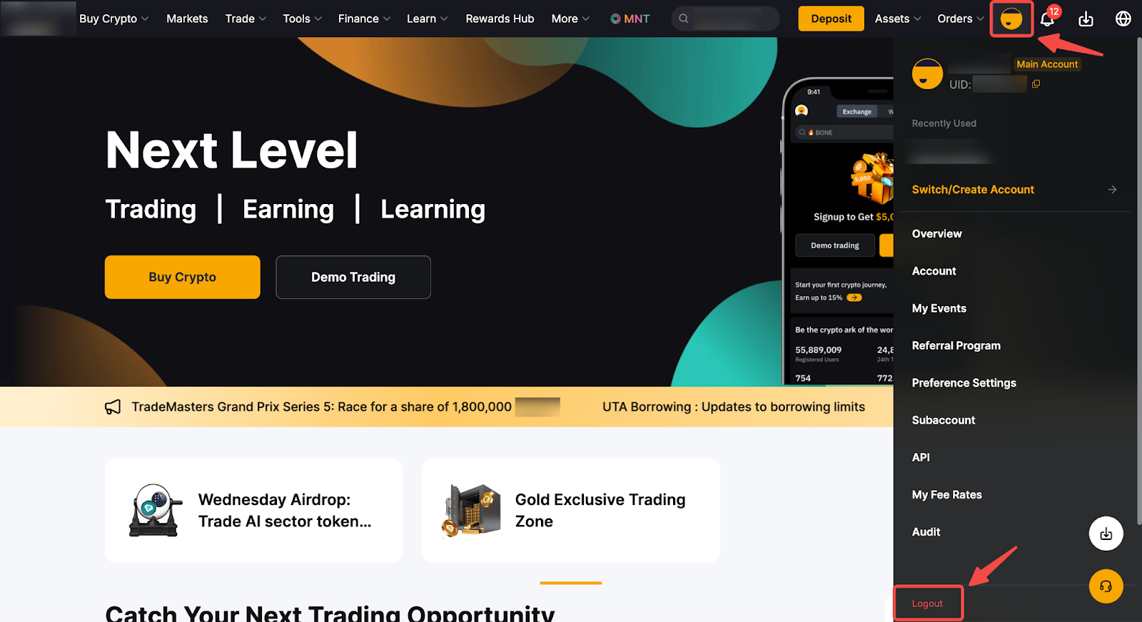 Щоб вийти з облікового запису Bybit через додаток, Ви можете перейти до свого центру користувача, а потім натиснути вкладку «Вийти». Для вебсайту Ви можете натиснути на значок профілю у верхньому правому куті (крок 1), а потім натиснути на вкладку «Вийти» (крок 2).