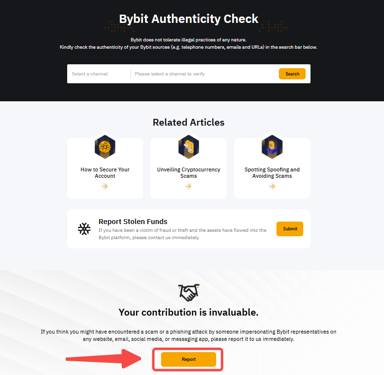 Будь ласка, скористайтеся перевіркою автентичності Bybit для перевірки будь-яких доменів, пов'язаних з Bybit, або джерел інформації (як-от телефонні номери, електронна пошта, URL-адреси або будь-які акаунти в соціальних мережах.).