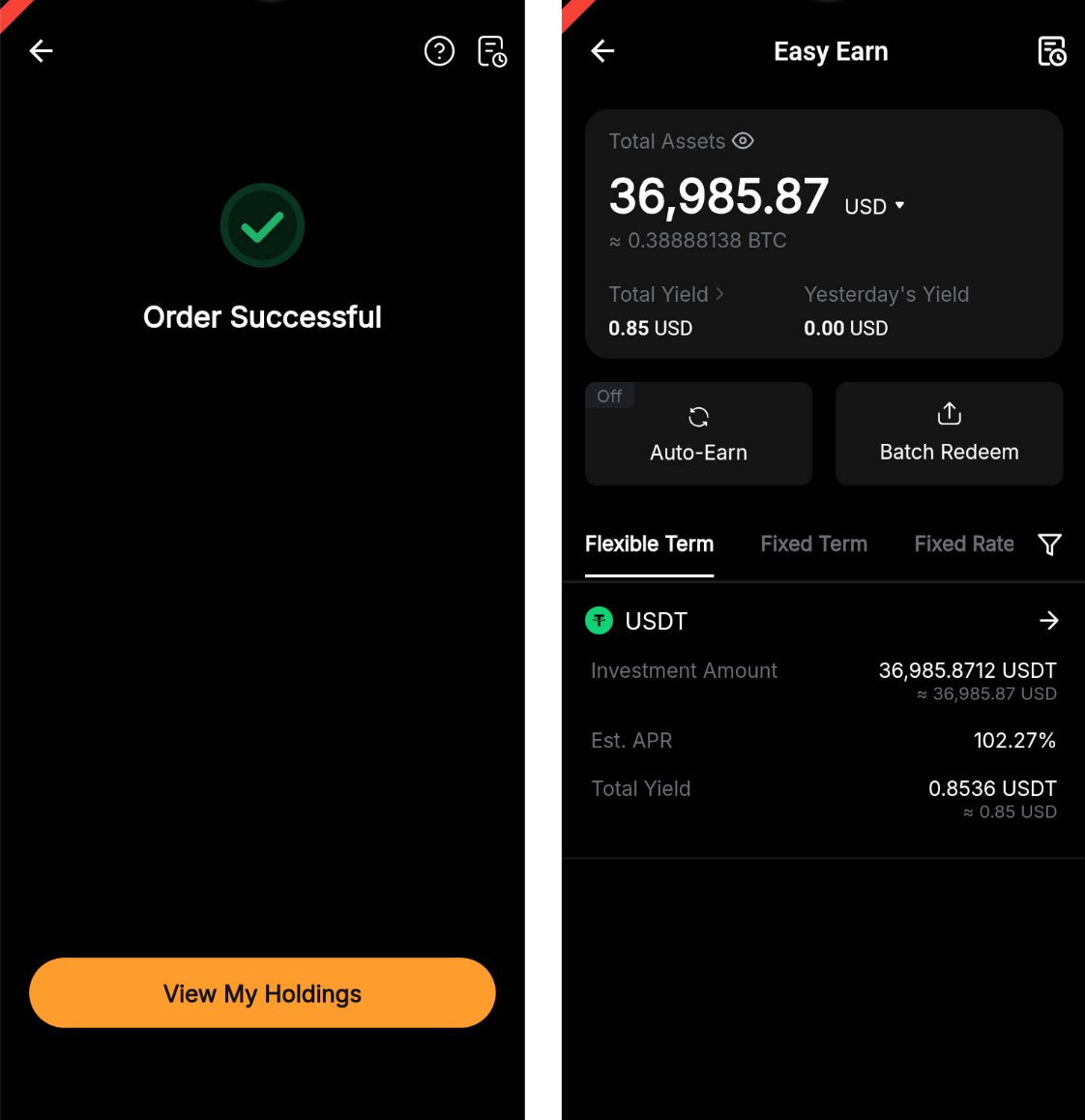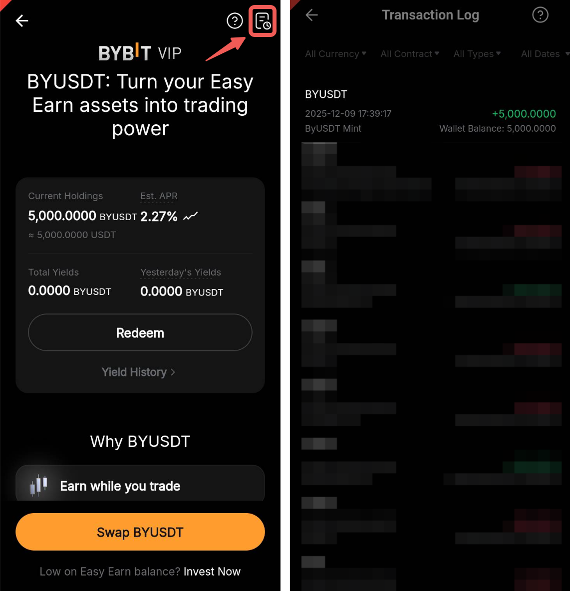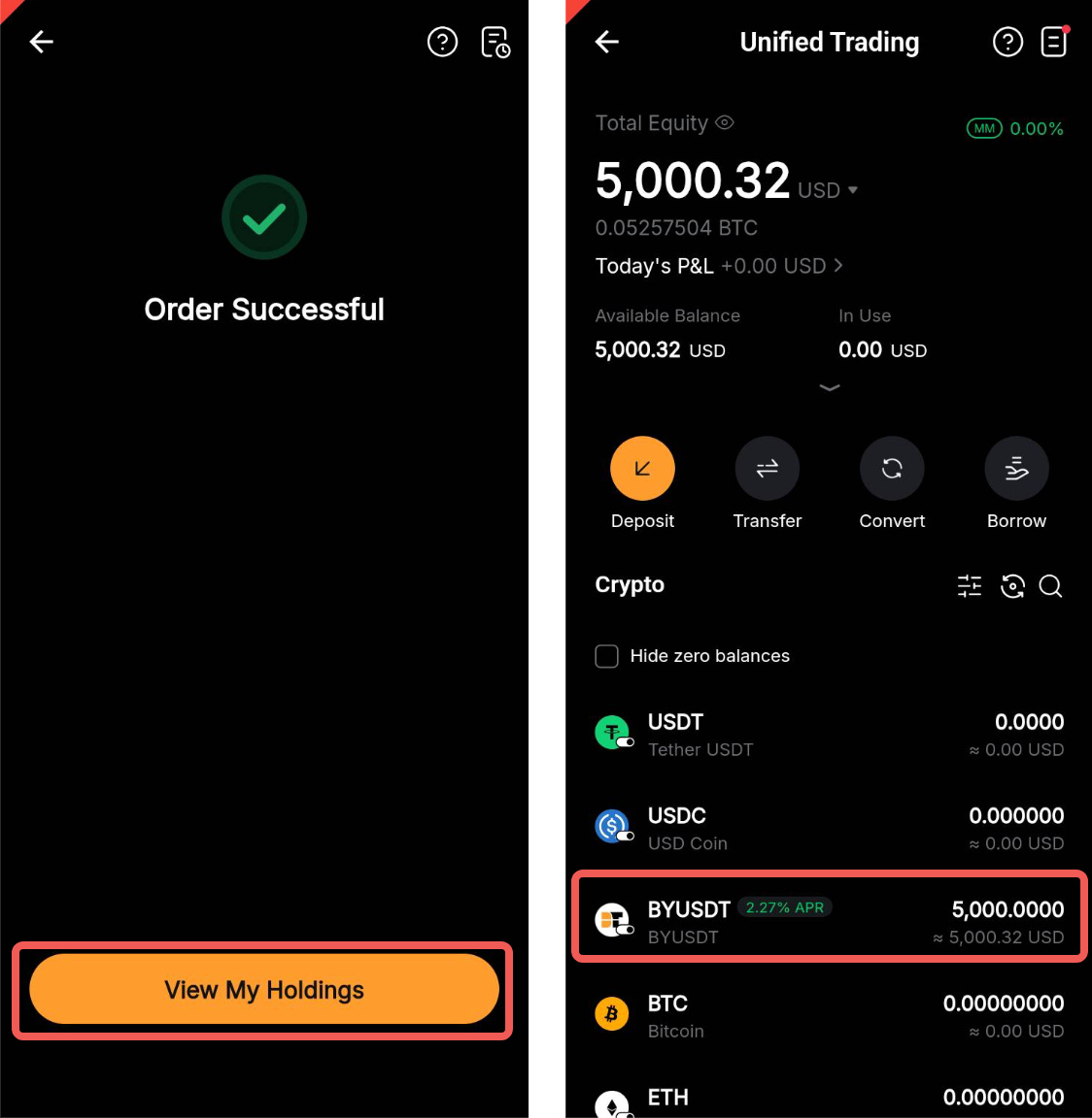 Після завершення обміну BYUSDT буде зарахований на UTA і автоматично увімкнений як забезпечення. Відповідна сума USDT буде вирахована з вашого балансу гнучких накопичень Easy Earn.