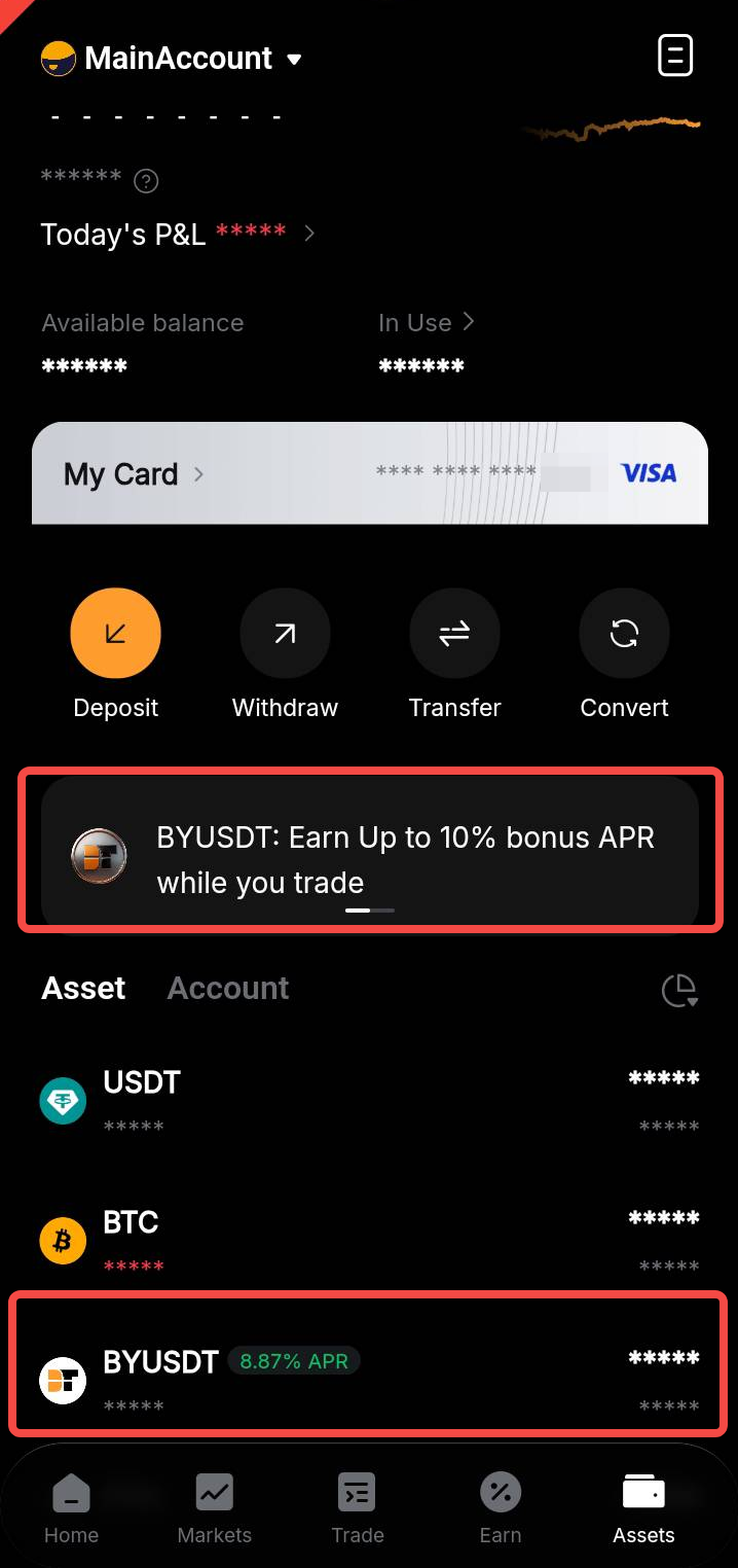 Крок 1: Увійдіть у свій акаунт Bybit і перейдіть на сторінку BYUSDT, перейшовши до Активів і торкнувшись банера посередині, або BYUSDT в розділі Активи.