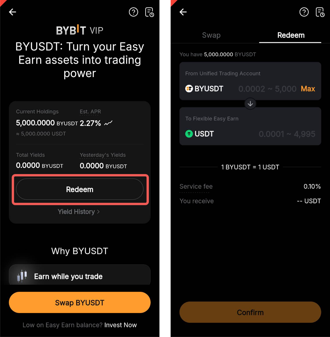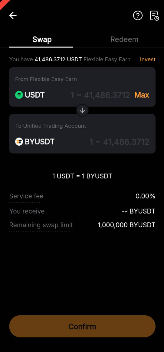 BYUSDT можна отримати, замінивши USDT, що знаходяться в гнучких накопиченнях Easy Earn. Після завершення обміну BYUSDT буде додано на ваш єдиний торговий аккаунт (UTA) як доступну маржу із співвідношенням вартості застави 100%. Він продовжуватиме генерувати прибутку, які відображаються у вигляді збільшення вашого балансу BYUSDT.