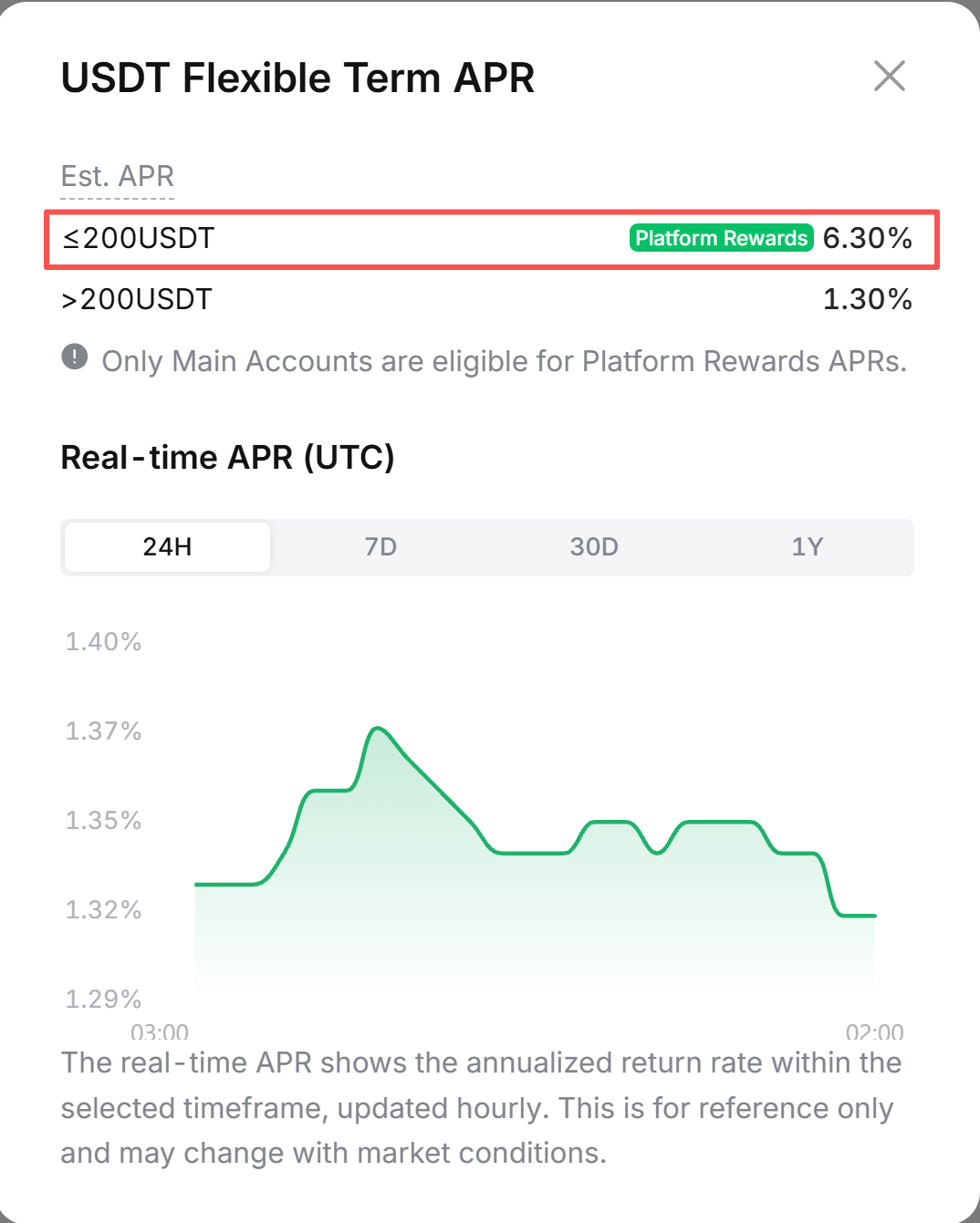 BYUSDT слідує тому ж механізму APR, що і USDT у гнучких накопиченнях Easy Earn, за винятком бонусного APR на платформі. Наприклад, якщо бонусний APR складає 6,3%, BYUSDT не матиме права на цю частину, і незалежно від суми, що утримується, застосовуватиметься лише базовий APR у розмірі 1,3%.