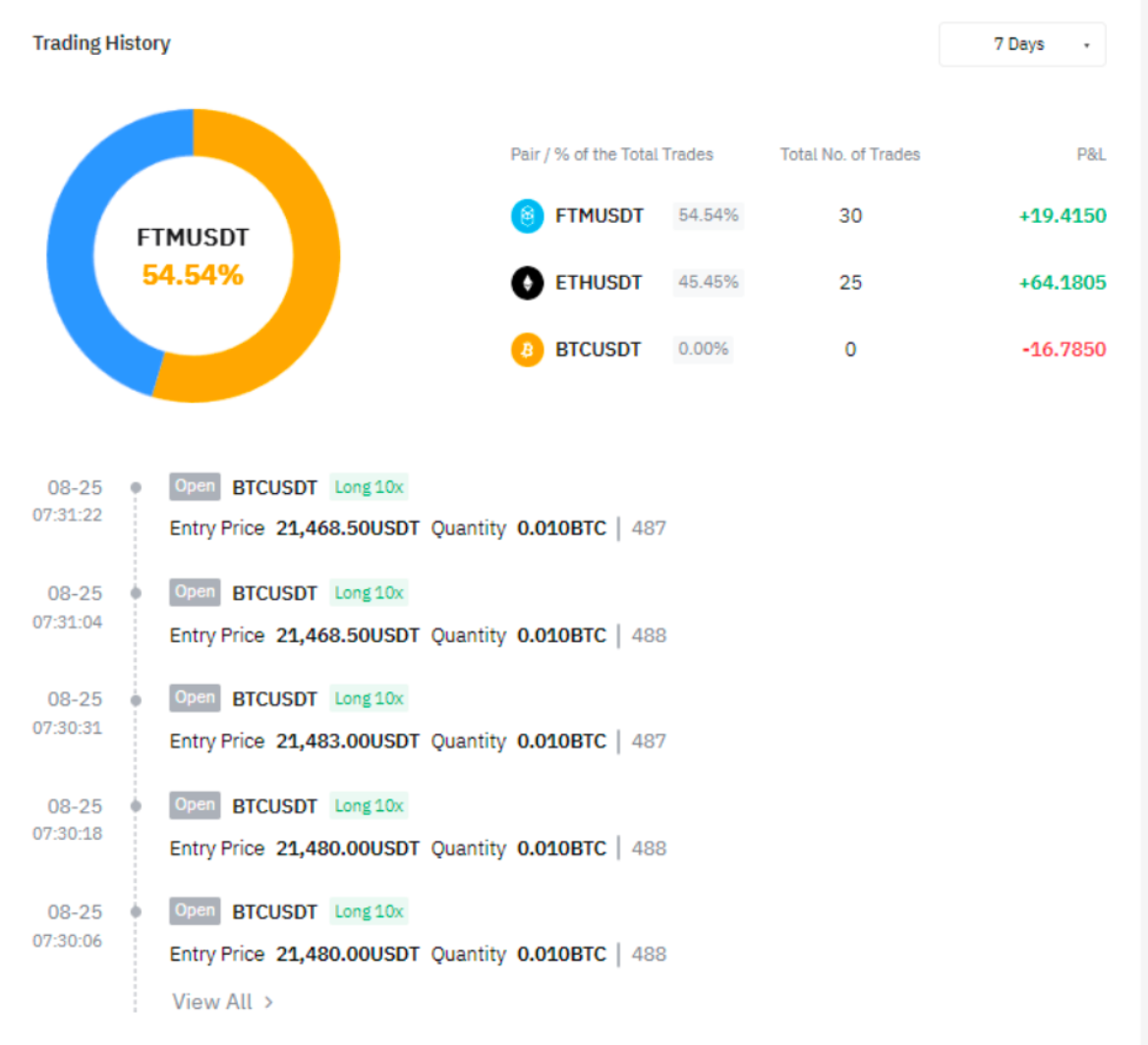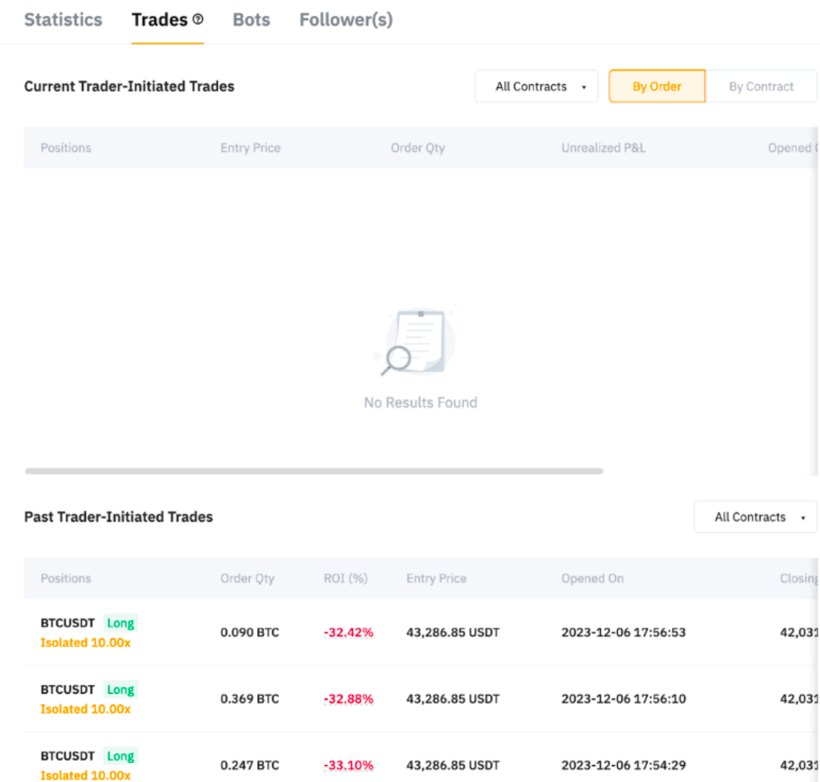 Пара/% від загальної к-ті угод, Загальна к-ть угод і P&L у розділі Історія торгівлі оновлюються щодня о 00:00. Крім того, кожна трансакція, яку ініціює майстер-трейдер, додається до цього розділу в режимі реального часу. Зверніть увагу, що тут відображатиметься лише торгова історія Безстрокових USDT контрактів.