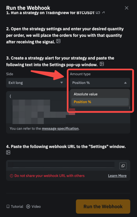 1. Ви можете вибрати тип суми на сторінці налаштувань вебхука або відредагувати значення параметра безпосередньо в шаблоні, вставленому в TradingView.