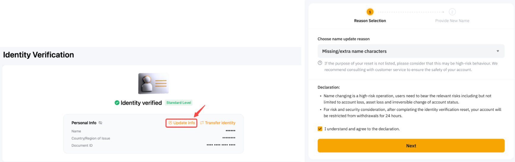 Ви можете оновити ім'я, вказане на сторінці KYC, натиснувши «Зміна даних» на сторінці підтвердження особи або перейшовши на сторінку безпосередньо тут. Потім вам потрібно буде вибрати причину, пройти перевірку безпеки та вказати правильне ім'я. Цей процес зазвичай займає близько 5 хвилин. Однак може знадобитися до одного (1) робочого дня для додаткової перевірки. Якщо час обробки перевищено, ви можете перевірити статус у Центр підтримки або зв’язатися безпосередньо з Командою з питань нормативно-правової відповідності за адресою complianceops@bybit.com.