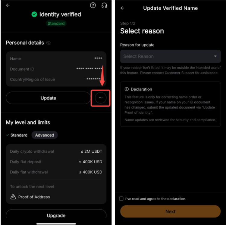 - Ця функція не використовується для оновлення імені, яке відбулось через оновлення даних про особу в урядовій базі даних. У таких випадках скористайтеся функцією «Оновити KYC».