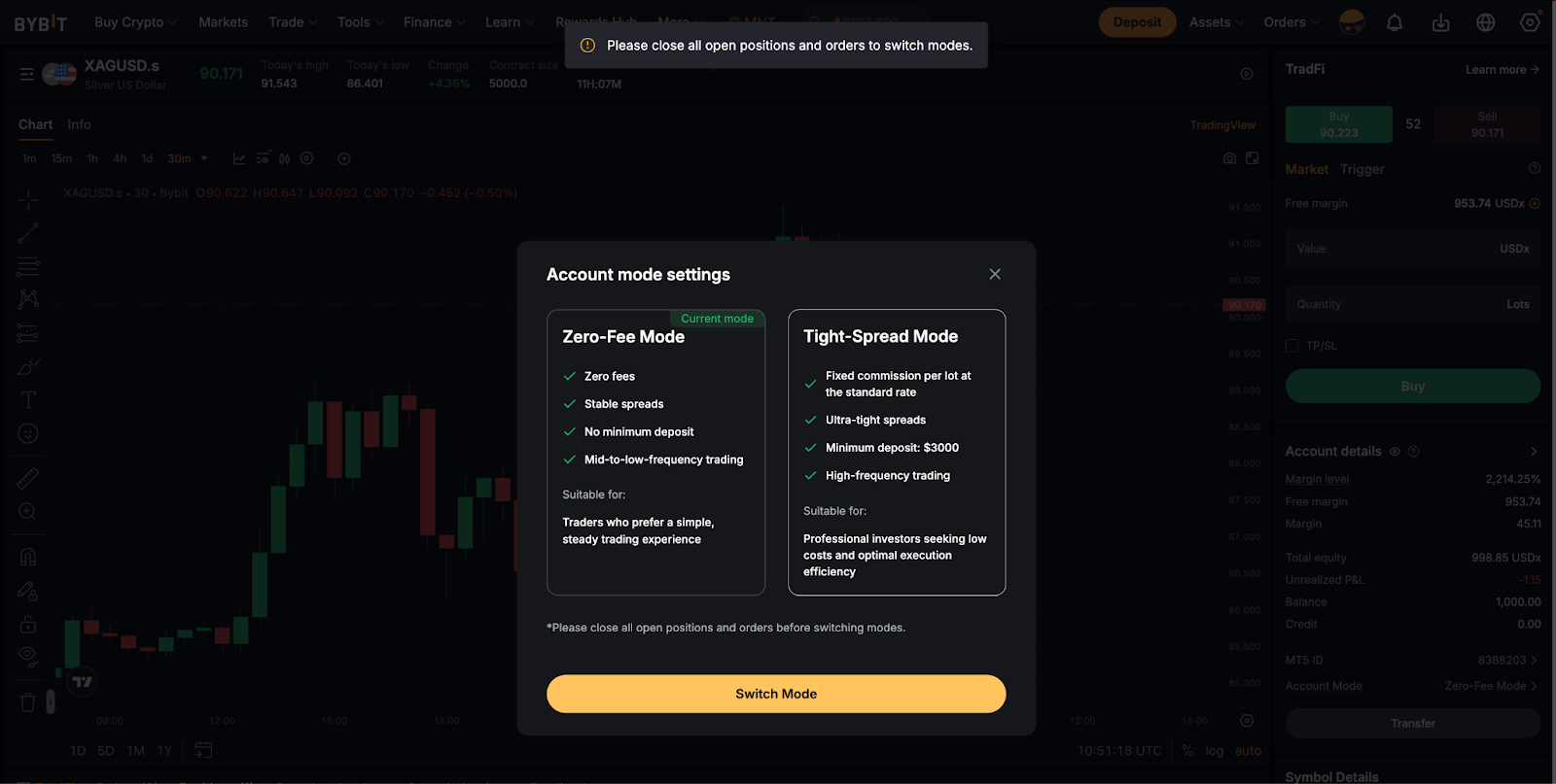 Крок 3. Натисніть на один із режимів, щоб продовжити. Ви успішно змінили режим облікового запису TradFi!