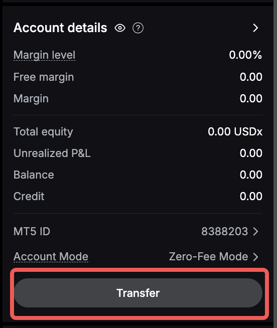 - Якщо ви не виконали вимоги щодо депозиту, натисніть кнопку «Переказ» у розділі «Відомості про рахунок» і виконайте необхідний переказ на свій рахунок TradFi.