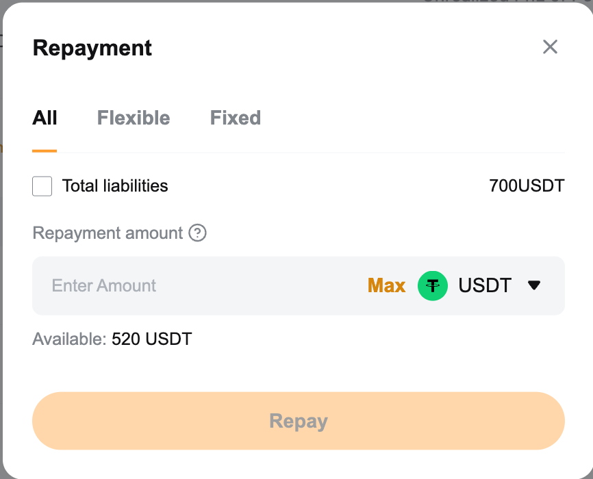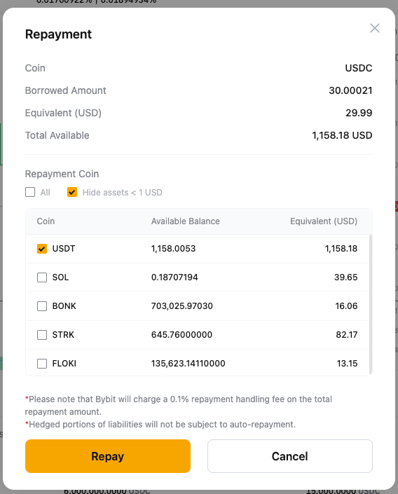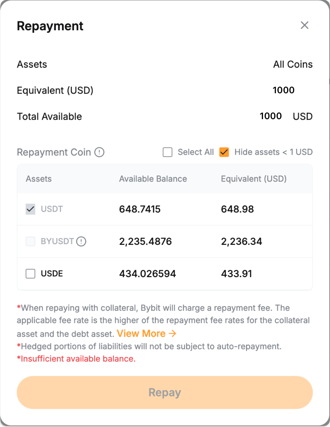Якщо у вас недостатньо позичених монет, ви можете здійснити повне погашення за допомогою інших активів, що використовуються як застава. Система конвертує заставу для погашення позичених монет, при цьому буде стягнуто комісію за обробку в розмірі 0,1%.