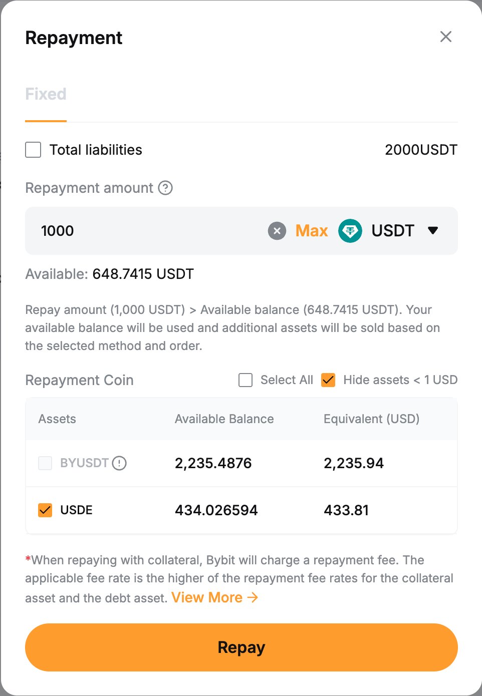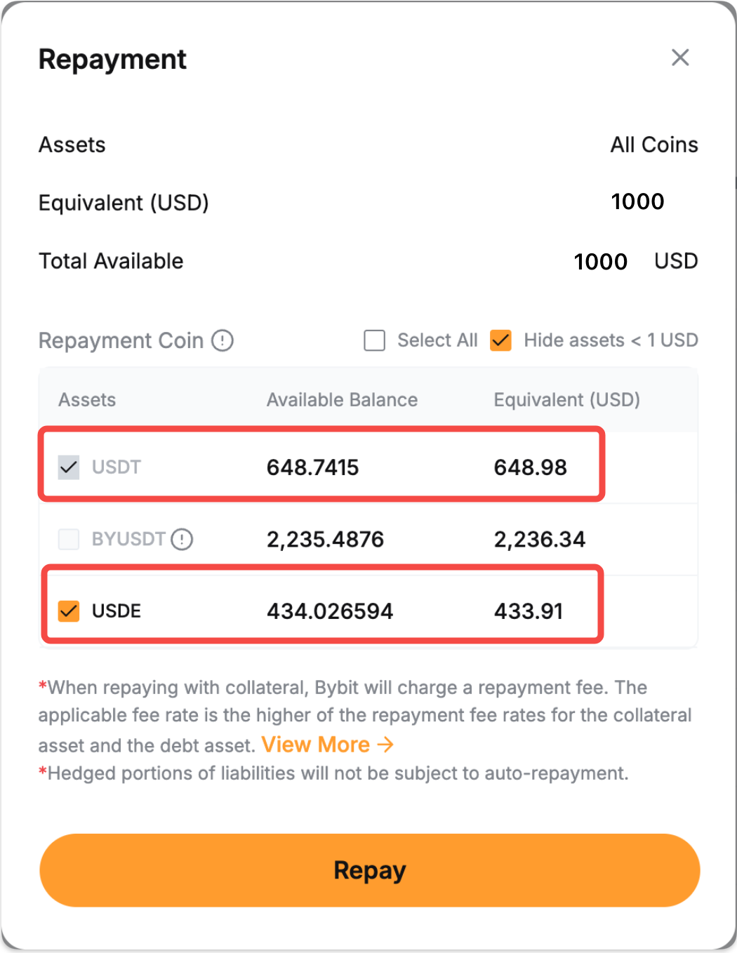 Підтримується лише повне погашення однією монетою або ви можете погасити всю суму, конвертуючи активи забезпечення.