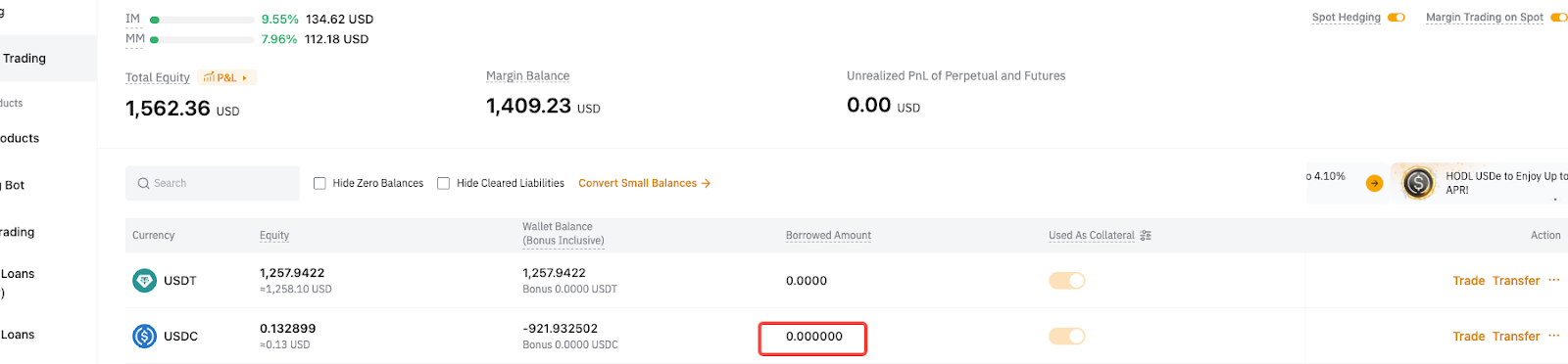 Після переказу в USDC лише Деривативні зобов’язання погашаються автоматично, тоді як Спотові зобов’язання залишаються несплаченими.