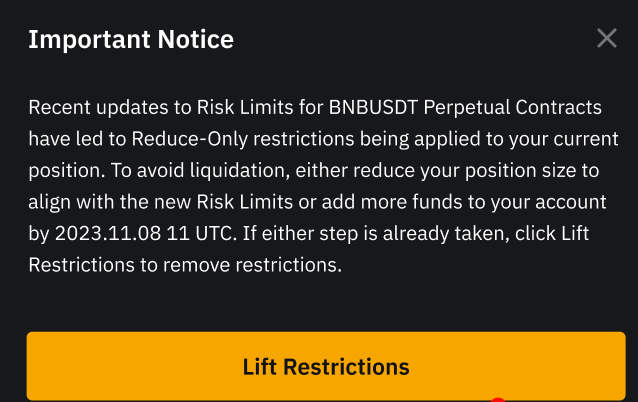 Якщо система вважатиме, що після коригування ризик вищий, то нові параметри ризику не застосовуватимуться до вашого акаунта негайно. У цьому випадку буде надано 10-денний буферний період, протягом якого вам буде дозволено розміщувати лише ордери «Скорочення позиції» або скасовувати ордери для конкретної торгової пари, про яку йдеться. Ви не зможете розмістити нові ринкові або лімітні ордери, які збільшать розмір позиції (умовні ордери залишаться незмінними), доки ви не додасте більше маржі до свого акаунта або позиції, щоб відповідати новому рівню ліміту ризику. Наявні ордери буде збережено.