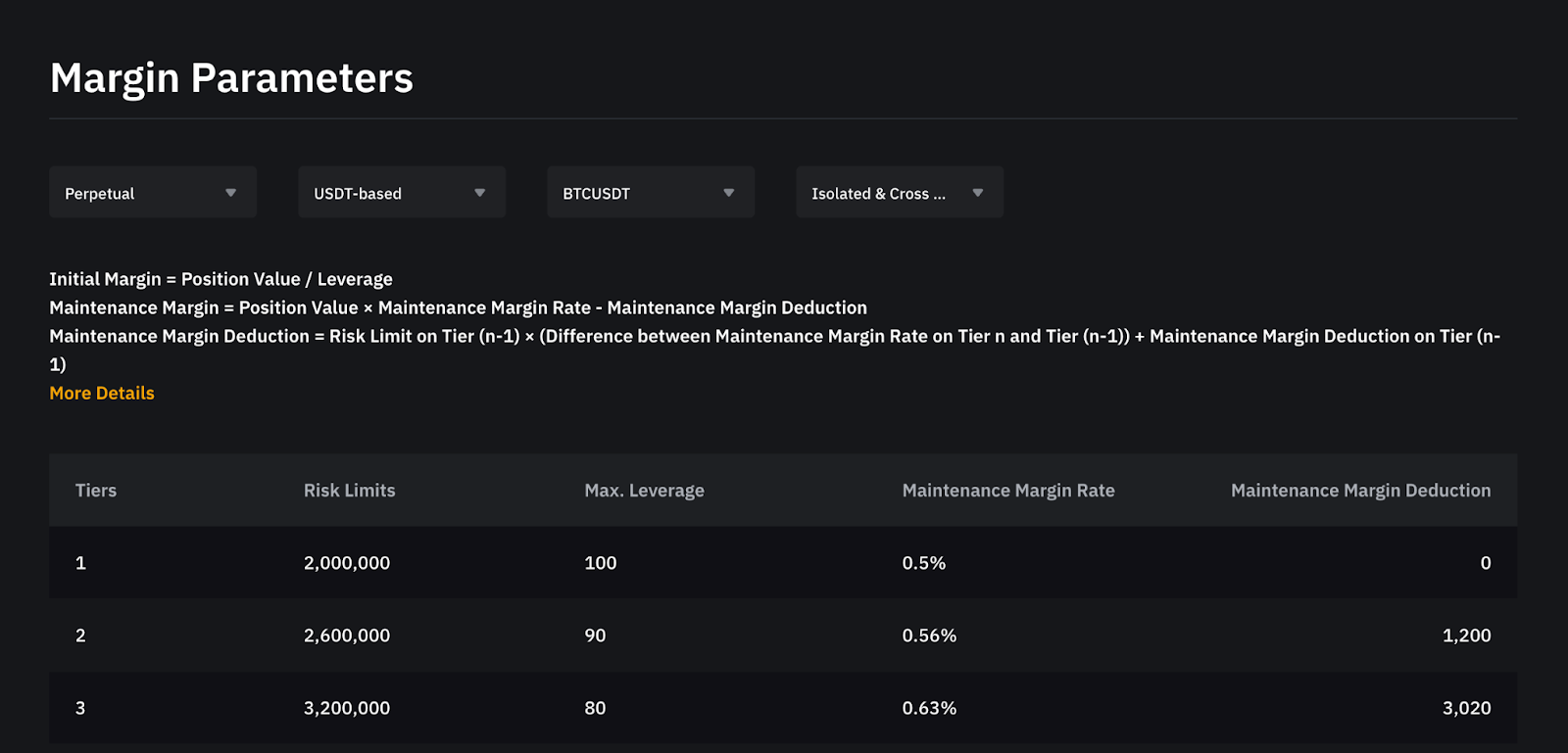 У міру збільшення вартості позиції система автоматично коригує ліміт ризику користувача на основі вартості позиції та активного ордера. Отже, вимоги до підтримувальної маржі та початкової маржі також будуть відповідним чином змінені. У випадках, коли користувачі не мають активних ордерів або позицій, ліміт ризику за замовчуванням встановлюється на найнижчий рівень.