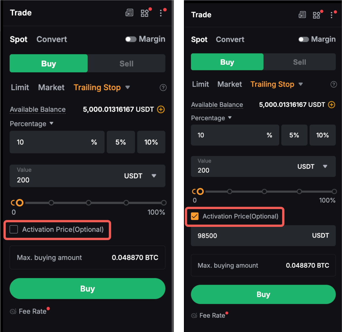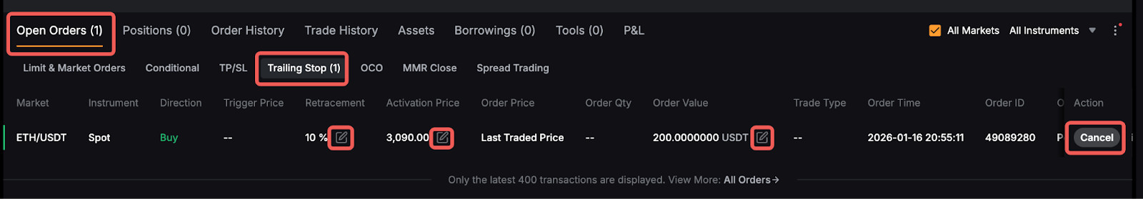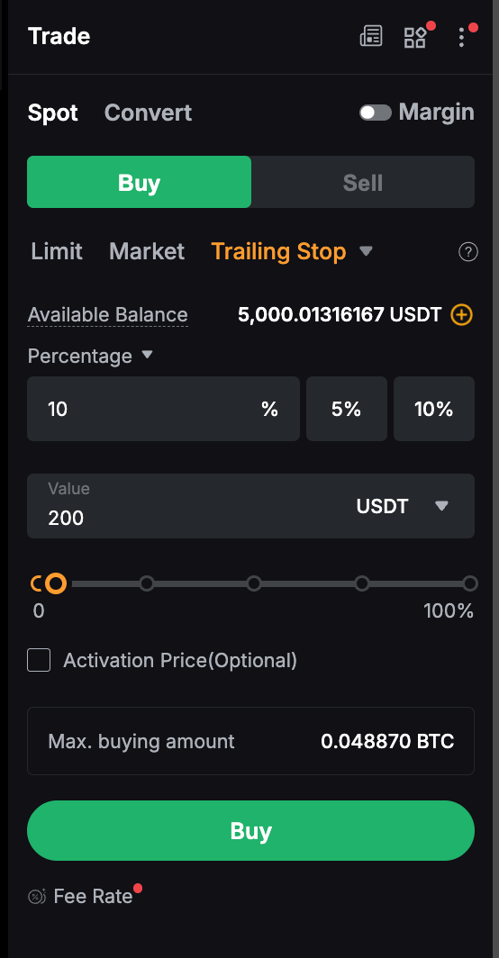 5. Якщо ви встановили ціну активації, трейлінг стоп-ордер буде активовано лише після досягнення ціни активації. Якщо ціна активації не встановлена, трейлінг стоп-ордер буде активовано негайно на основі поточної ціна останньої угоди після розміщення ордера.