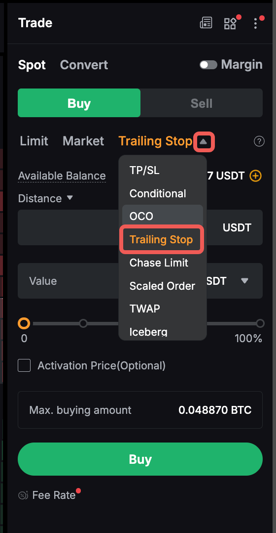 Крок 1. Перейдіть на сторінку Спотової торгівлі та виберіть ордер Трейлінг стоп-ордер.