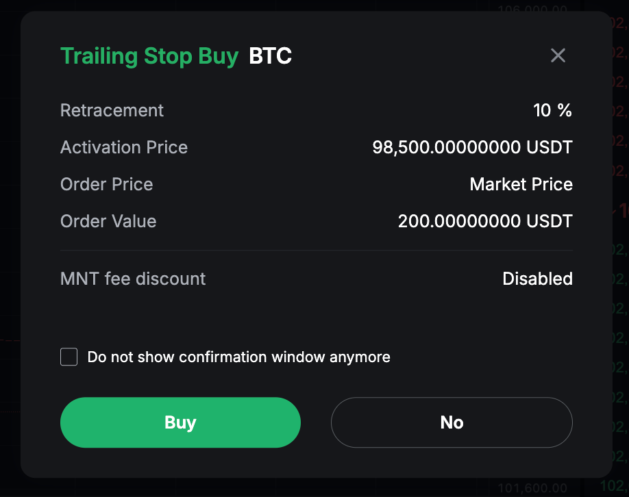 Натисніть «Купівля» або «Продаж», і ви успішно розмістили свій трейлінг стоп-ордер!