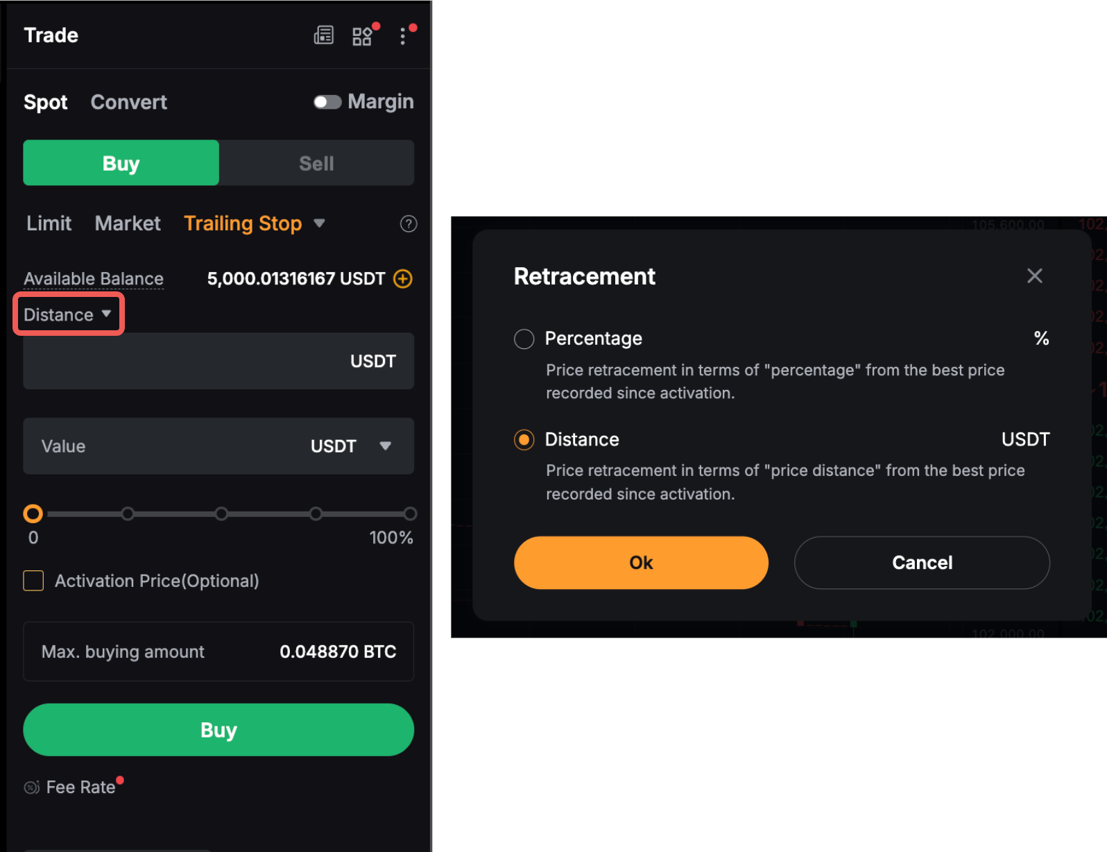 Трейлінг стоп-ордер у спотовій та маржинальній торгівлі – це динамічний тип ордера, який функціонує як розширена функція для торгівлі на купівлю та продаж. Він працює як стоп-ордер, який відстежує ринкову ціну активу або позиції та автоматично коригує стоп-ордер, щоб мінімізувати втрати або зафіксувати прибуток, коли ціна рухається на користь трейдера. Після визначення Трейлінг стоп-ордера, якщо ринкова ціна досягає певного рівня, а потім повертається на заздалегідь визначену користувачем величину, буде запущено ринковий ордер.