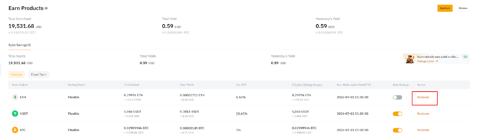 Bước 1: Vào Tài Sản → Sinh Lời để truy cập trang Sản Phẩm Sinh Lời. Chọn gói Kỳ Hạn Linh Hoạt mà bạn muốn quy đổi, xem lại chi tiết lệnh và nhấp vào Quy Đổi.
