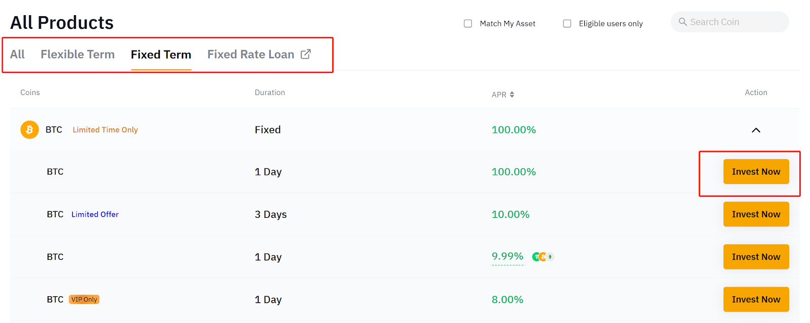 Bước 2: Chọn gói Sinh Lời Dễ Dàng ưa thích của bạn dựa trên loại coin, thời hạn và APR, sau đó nhấp vào Đầu Tư Ngay.