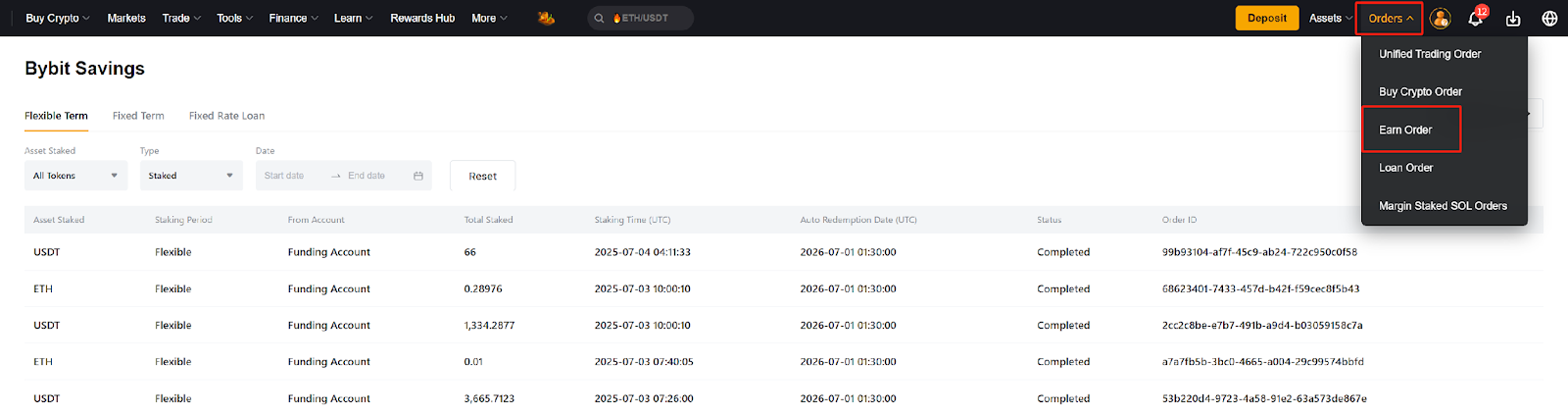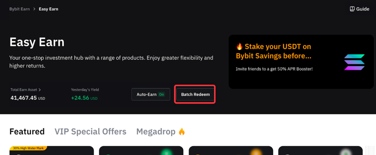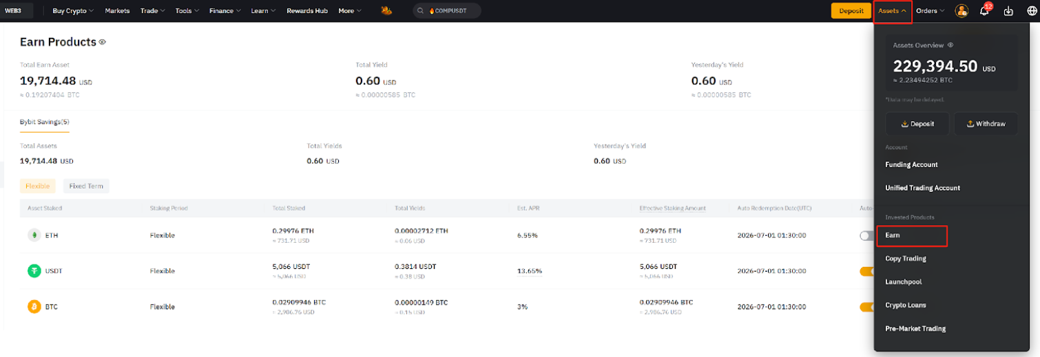 Bước 1: Đăng nhập vào tài khoản Bybit của bạn và nhấp vào Tài Chính → Sinh Lời → Sinh Lời Dễ Dàng trên thanh điều hướng.