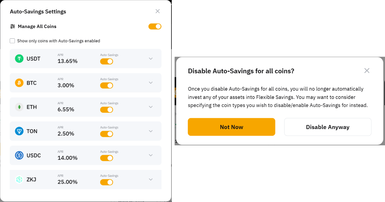 Bước 2: Trang Cài Đặt Tự Động Sinh Lời sẽ hiển thị. Để tắt Tự Động Sinh Lời cho tất cả các đồng cùng lúc, hãy tắt tùy chọn Quản Lý Tất Cả Coin. Ngoài ra, bạn cũng có thể tắt Tự Động Sinh Lời riêng lẻ cho từng coin.