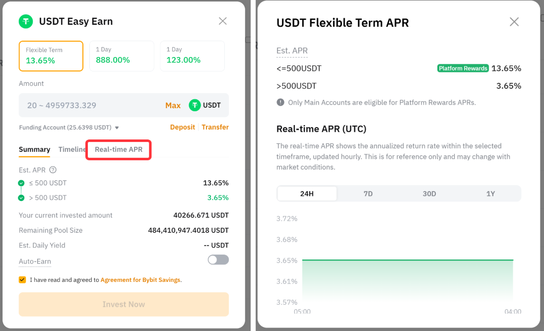 Đối với các sản phẩm Kỳ Hạn Linh Hoạt, bạn sẽ thấy biểu tượng APR được hiển thị theo thời gian thực. Hãy nhấp vào đó để chuyển đổi giữa 24 giờ, 7 ngày, 30 ngày và 1 năm để xem hiệu suất trong các khoảng thời gian khác nhau. Đường gạch dưới dạng chấm cho biết APR được áp dụng theo cấp, và thay đổi tùy theo số tiền bạn đầu tư.