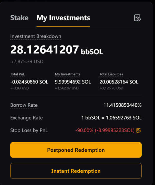 • Hoãn Nhận Lại: Nhận toàn bộ vốn gốc và toàn bộ thu nhập sau thời gian xử lý 1‒4 ngày, trong thời gian đó lãi suất sẽ tiếp tục được tích lũy. bbSOL của bạn sẽ được chuyển đổi sang SOL theo tỷ giá hối đoái thời gian thực khi bạn gửi yêu cầu nhận lại.