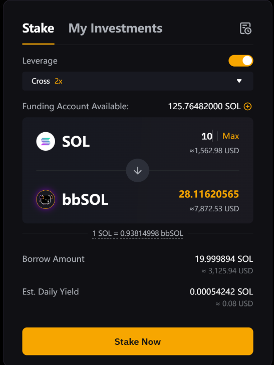 Số lượng bbSOL dự kiến bạn sẽ nhận được, được tính toán dựa trên đòn bẩy, SOL đã stake và tỷ giá hối đoái theo thời gian thực giữa SOL và bbSOL.